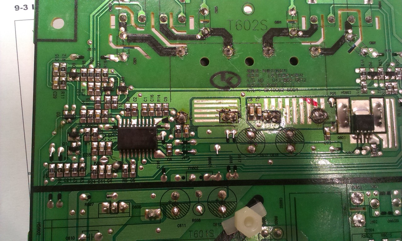 Hibásként vettem. Nem volt javítva elöttem, gyáriak voltak a forrasztások. Úgy hiányzik róla, hogy pl a vezérlő ic valamely kivezetése ami a rajz szerint megy valahová, pl OUTD, az csak le van forrasztva, így az egész ág, ami a rajzon rá csatlakozik hiányzik. Bocs, ha nem voltam egyértelmű, a hiányt úgy értettem, hogy gyárilag nincs rajta minden, ami a service manualban szerepel. Sőt jelölés eltérések is vannak.