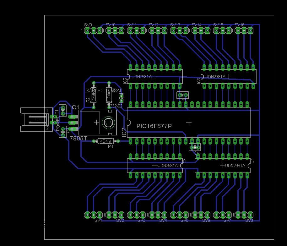 A 4 db 100n ból csak egyet hagyj meg azt viszont tervezd a táplábakhoz a lehető legközelebb,miért terveztél rá 4 et?? A 13-14 es lábra ne tervezz kimenetet oda egy 4 MHz -s kristályt és 2 db 22pf os kondit tegyél , a 16f877 nem működik kristály vagy külső rc tag nélkül nélkül .