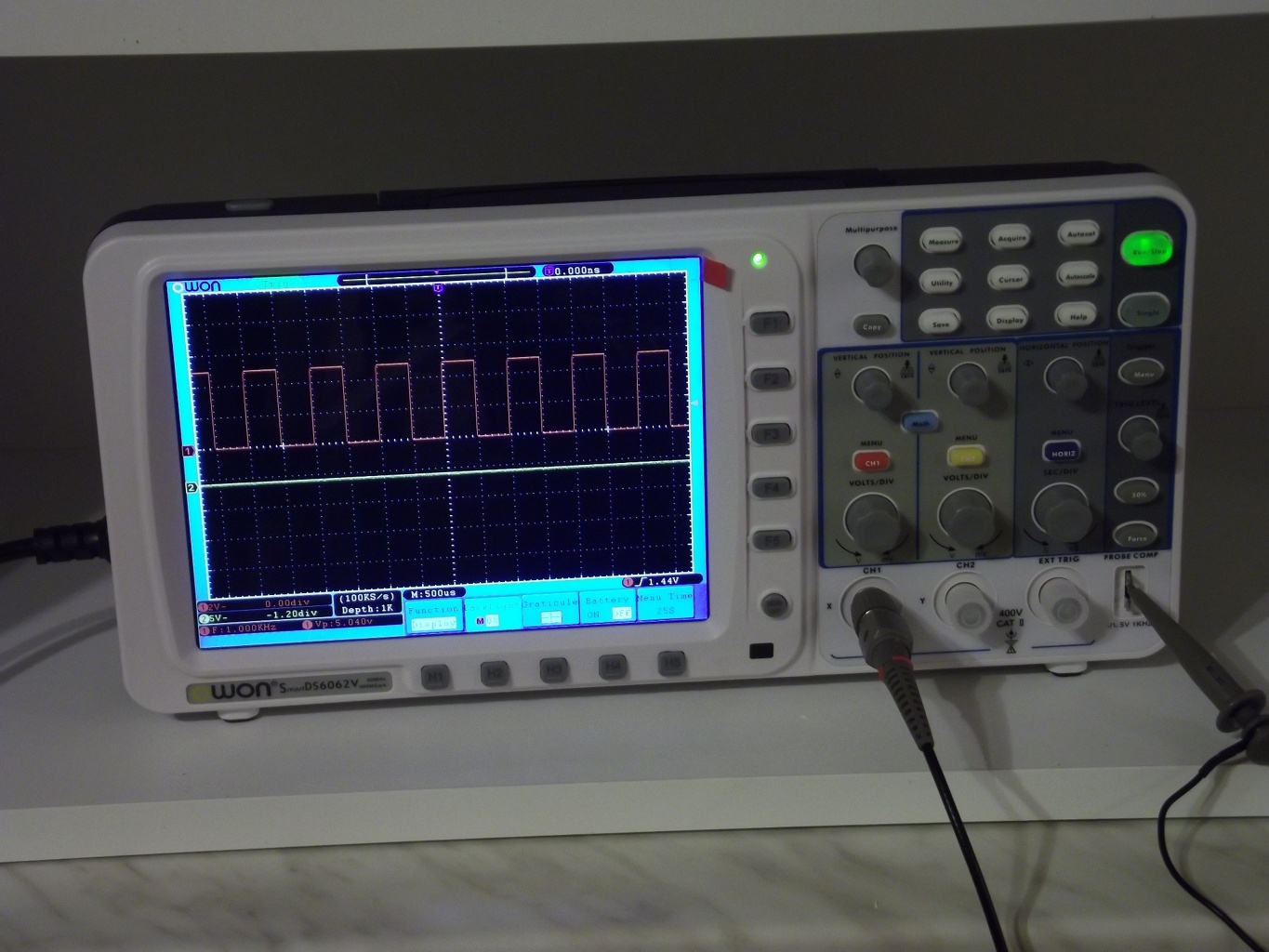 60MHz, 500MS/s, két csatorna, 10MS memória(!!!), 800x600-as LCD, USB és LAN(!) csatlakozó, akkumulátoros üzemmód... nagyon jó. Egyenlőre még ismerkedünk, nagyon más ez mint egy analóg.