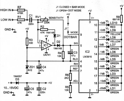 Igazán jó kivezérlésjelzőt nehéz LM3914 IC-vel építeni, mert lineáris feszültségosztó van benne. Így csak 20dB-t tud átfogni. 20LED-re bővítve még mindig csak 26dB-ig jutsz el.