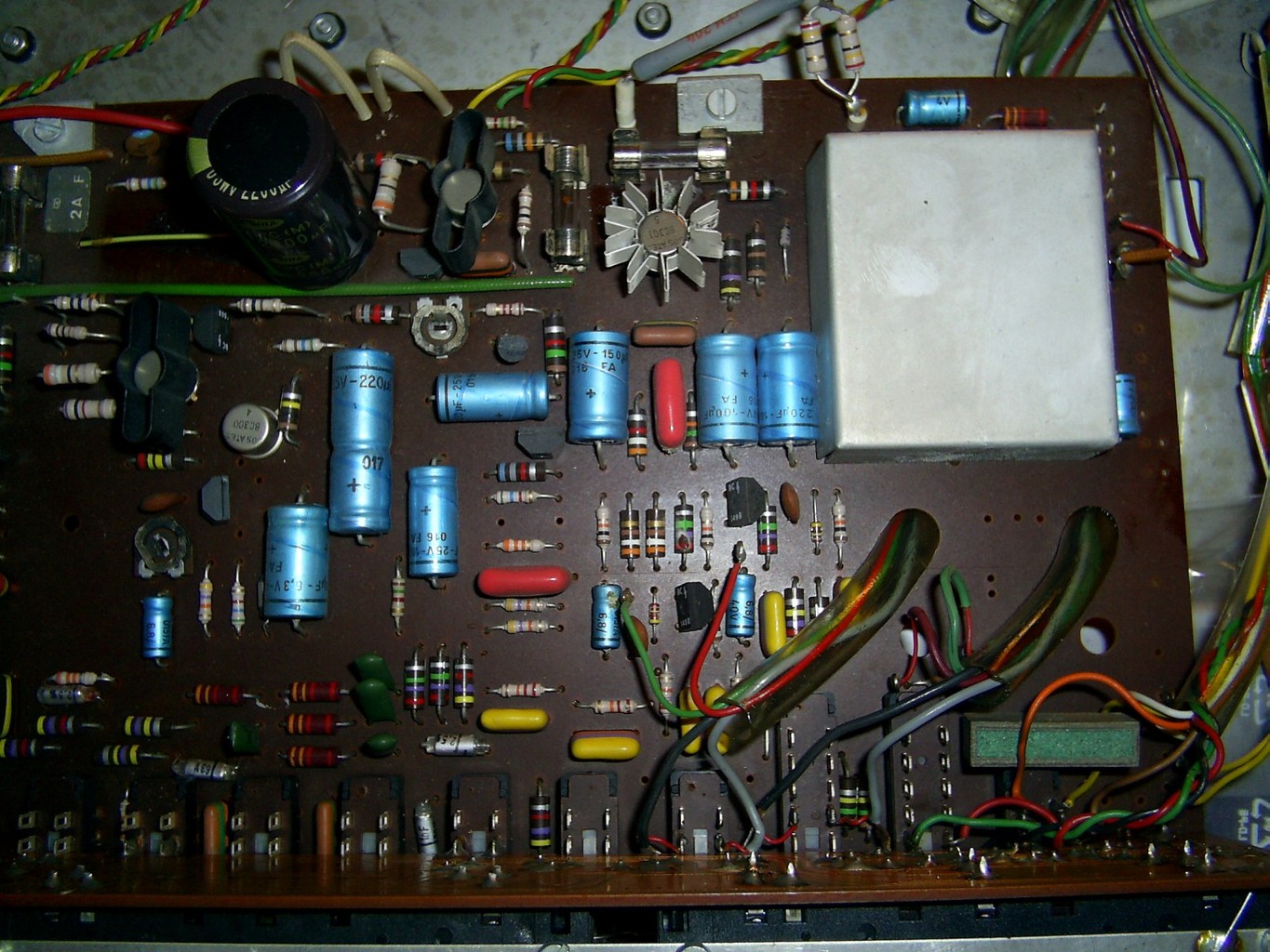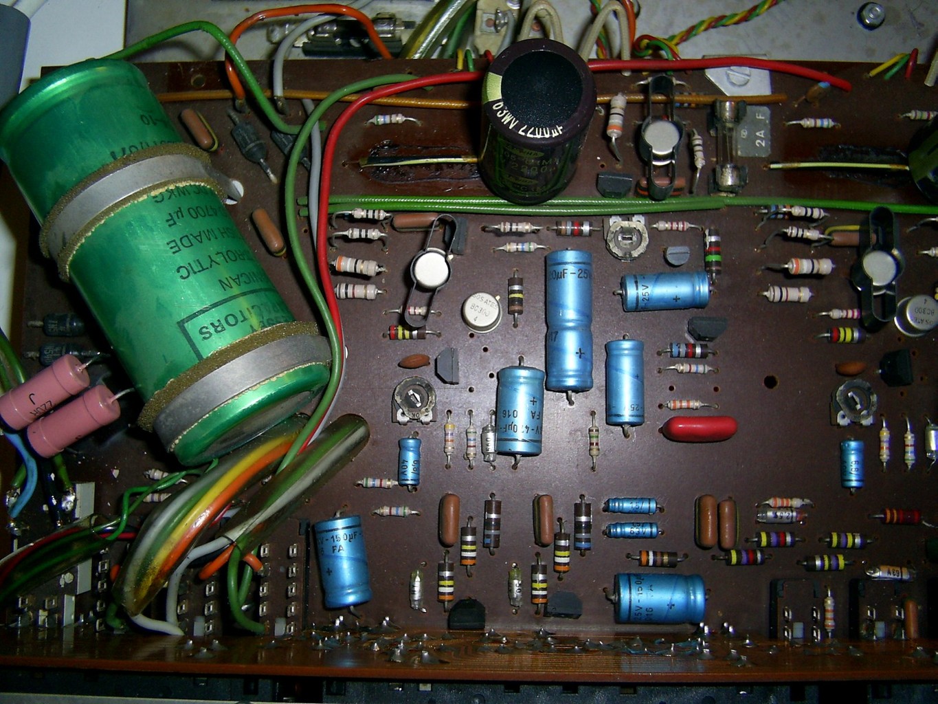 A 4700µF-os nagy zöld kondi már lett cserélve és semmi változás, a képeken még látható 2db álló kondi, ami eredetileg 2db axiális volt, de se a régiekkel se ezekkel nem lehet szóra bírni. Jelenleg egyébként áll a projekt, mert méricskélés közben volt egy kisebb villanás meg némi füst