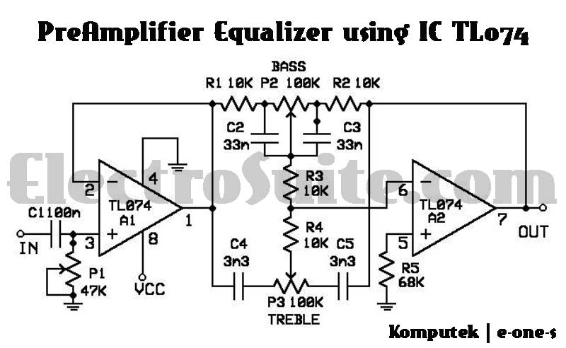 A1 csak impedanciát illeszt (emitterkövető). A kiemelés akkor a legnagyobb, ha a potik csúszkája a bemenet irányában van, tehát R1 és C4 felé van tekerve. Hogy mennyi arról csatoltam képet.