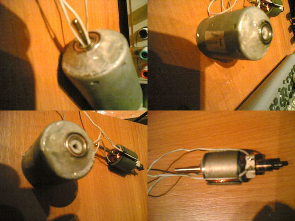Így gyorsban elég recska minőségűek lettek a képek, ezért összekicsinyítettem őket egybe. Remélem azért látszik a lényeg. Fogtam a motort, vágtam az elején egy nagyobb lyukat. Vettem egy csapágyat, odaragasztottam a lyuk fölé. A csapágy belső részére faragtam egy műanyag darabot, aminek a közepébe fúrtam egy lyukat a tengelynek és a kivezető drótoknak, amiket a forgórész aljába forrasztottam... Ha valami nem világos, kérdezz..