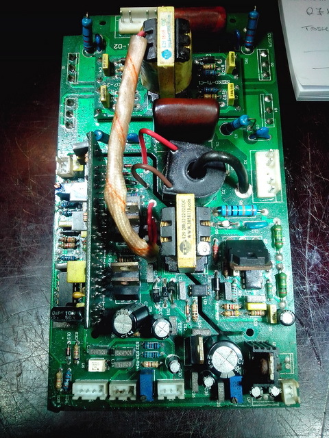 A fényképeket nézve tisztán látszik a tervezett elavulás nyoma. A trafót úgy tették rá a vezetősávokra,hogy nem tettek alá szigetelőlemezt. A trafó terhelésekor fellépő rezonancia pedig el erodálta a vezetősávokat, sőt a ferriten keresztül zárlatba került a szabályzóköri rész a főáramú résszel,mint ahogy látszik is a trafó alján. Jó néhány alkatrész elhalálozhatott emiatt.