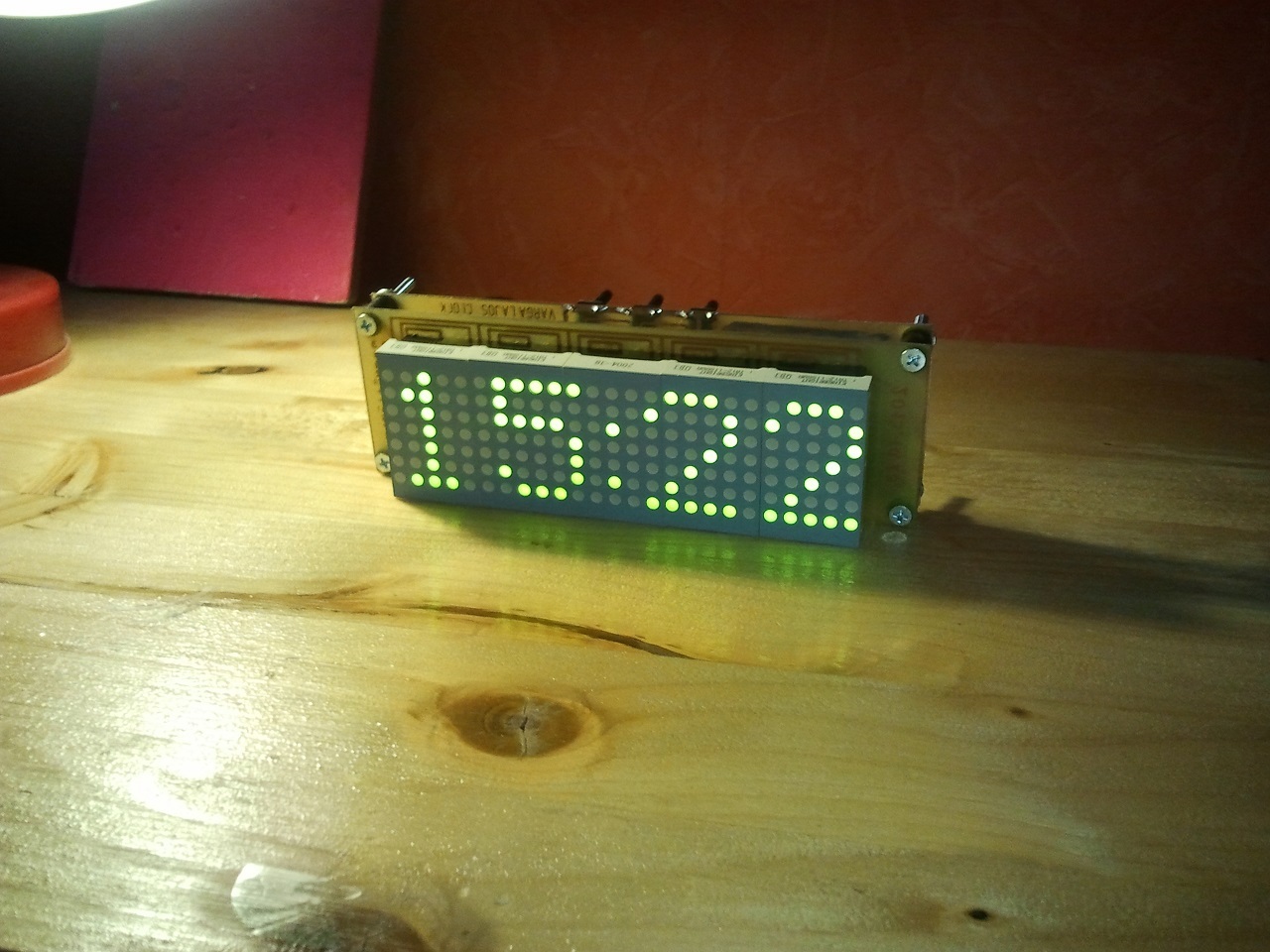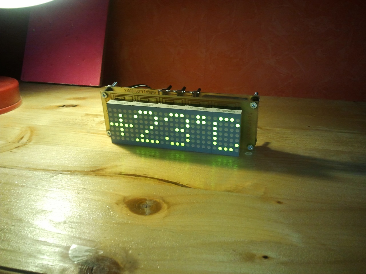 Ma készültem el a lajos1969 által is elkészített és korábban itt bemutatott, orosz oldalon publikált led mátrix órával. Lajos által módosított paneltervet használtam fel hozzá (köszönet neki a pic programozásért is) Még egy kis fa dobozkát eszkábálok neki, a legközelebbi szabadidőmben. Az 5x7-es led mátrixokat egy tüskesor aljzatba helyeztem bele, így nem kellett beforrasztani, bármikor egyszerűen cserélhető, ha megunnám a zöld színt, alatta pedig kényelmesen elfértek a meghajtó IC-k.