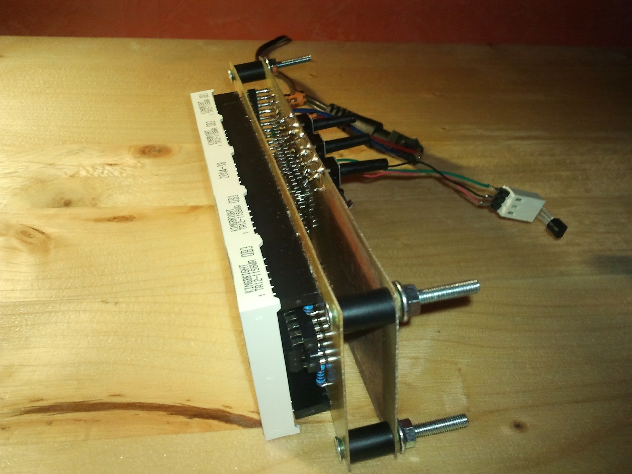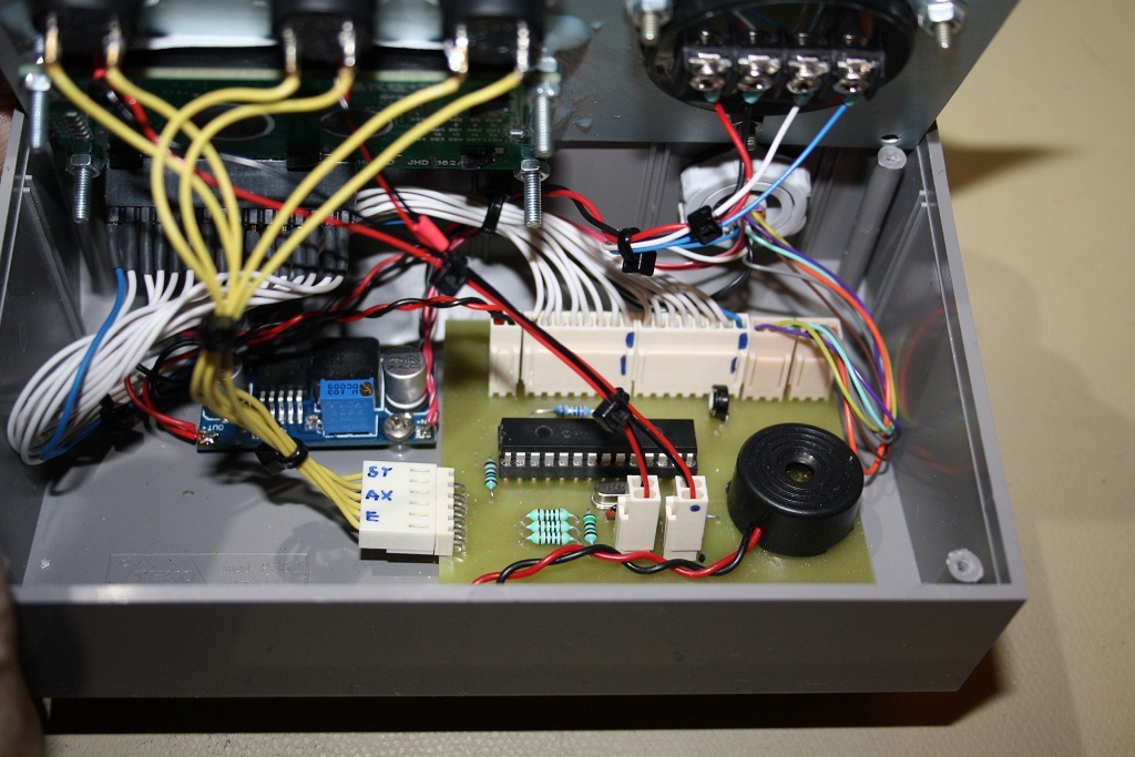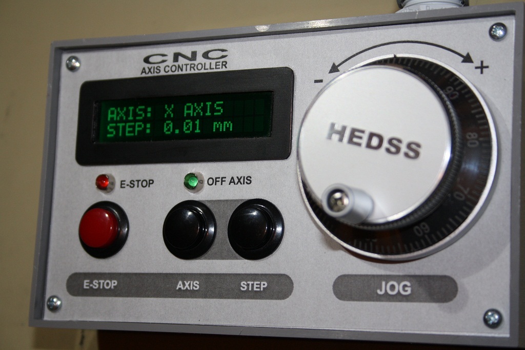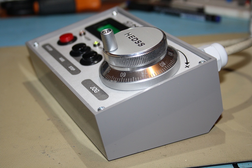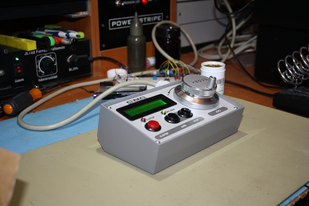 Készítettem a linuxcnc-hez egy kézi kereket, tengelyválasztóval, lépésválasztóval, E-STOP funkcióval. Mindez az LPT2 portra lett illesztve, no itt jön a képbe vanzerr kolléga, kedves barátom, aki lebilincselő linux bűvészkedésével illesztette az eszközt az LPT2 portra. Az LPT1-en a motorokat ezérlem, az LPT2-re pedig a periféria került. No és mivel nem fért el a gépházban az LPT2 kártya, ezért egy úgynevezett Rieser kártyával, illetve kábellel kivezettem a PCI slotot a gépházon kívülre, ahová építettem egy külön kis dobozt a kártyának.