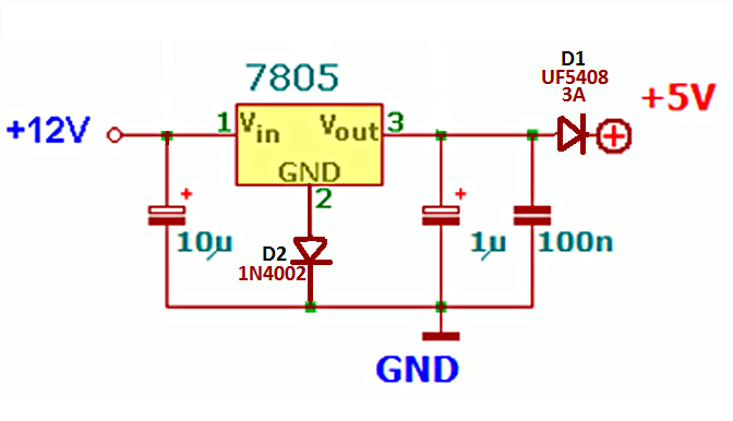 Üdv! Tönkre ment egy kis mini USB-s telefontöltőm. Csináltam egyet L7805-ös IC-vel de eszembe jutott egy korábban látott IC védelem és kíváncsiságból berajzoltam az ott látott szisztéma szerint 2 diódát az áramkörbe. Azt remélem, hogy ha megszűnne az áramkör tápfeszültsége D1 nem engedne visszáramot az IC-re, fordított polaritás ellen is védene (?) D2 pedig visszanyerné az elvesztett 0.7V-ot a kimenőből a test megemelésével.