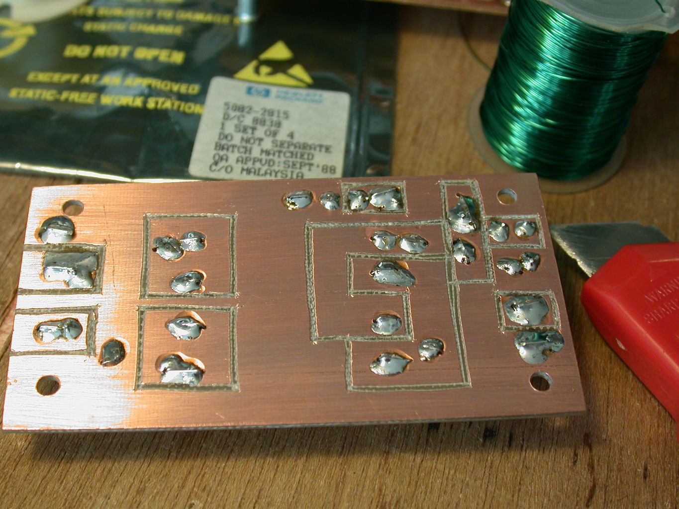 Igenis a gyerekeket meg lehet és meg is kell (!) tanítani a védőszemüveg, gumikesztyű használatára és az általános előírásokra (szabad tér és mindig álljon rendelkezésre langyos tiszta víz és szappan!). A gyerekek ezt gyorsan elsajátítják és nehezen fognak lemondani róla. Egy nyolcadikos, rádiós szakkörös gyereknek egy panelgyártás max 20 perc nekem 5 ! Mellékelek egy képet az 5 perces panel minőségéről! Az 5 perc a kinyomtatástól a vasaláson át az első fúrásig tart. És nem kell szutykolni a papíron való tervezgetéssel, a panel kapirgálással és ha akarom 20 példányba gyártom le, ha eltévesztek valami akkor kijavítom és újranyomtatom, újramaratom. Ezzel is haladni kellene, a technika nem követeli meg ezt a szerelési módot mint a mikrohullám. Véleményem szerint ezt kellene propagálni és a rendes kulturált panelgyártást! Megjegyzem vaskloriddal is lehet maratni nem csak sóssavas hidrogénperoxiddal. Haladjunk a korral....