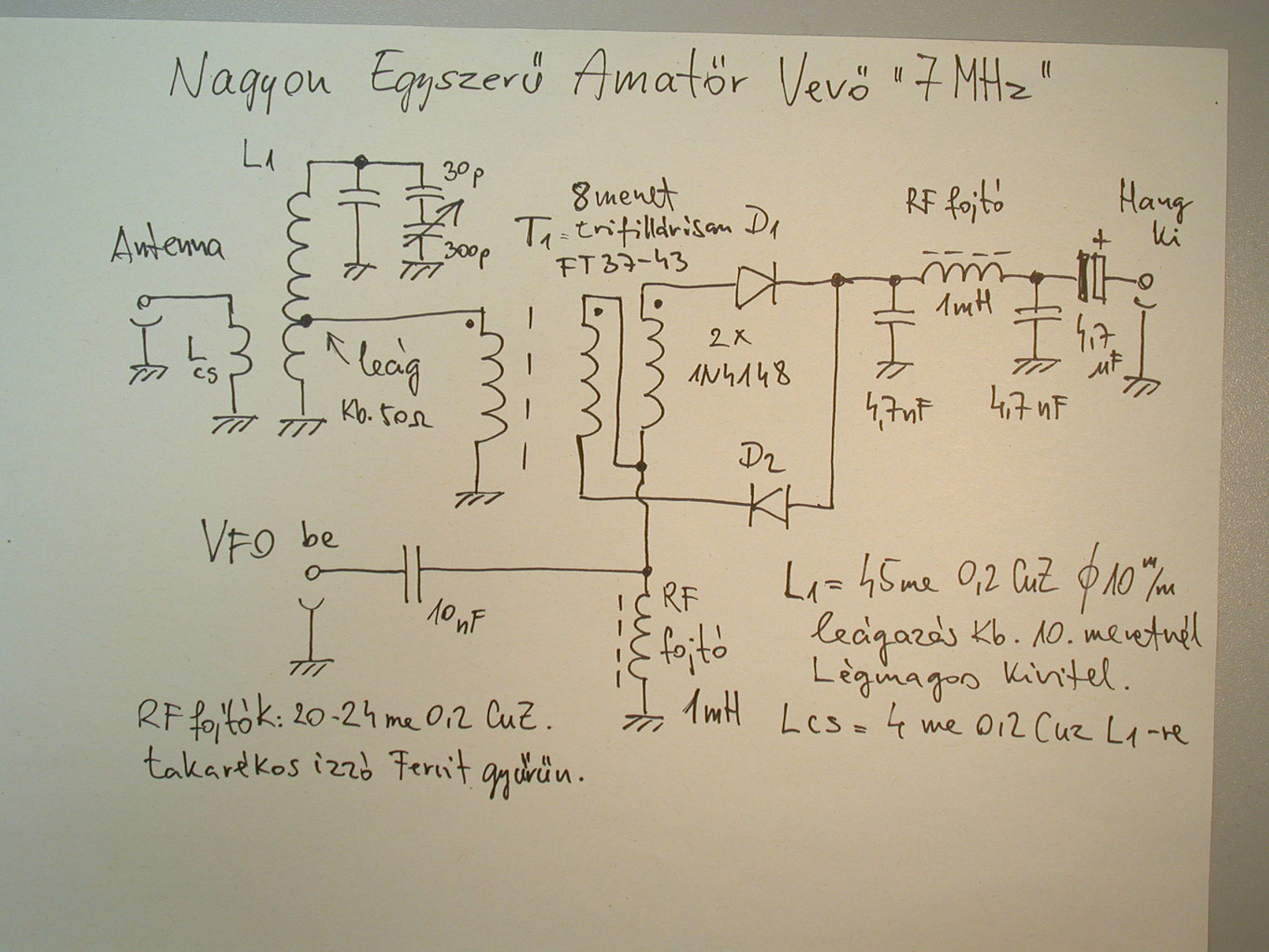 Csak, hogy gyönyörködhessetek, vagyis inkább a kezdők biztatására ma készítettem ezt a "fél órás" rádió panelt. Ez egy nagyon egyszerű megfigyelő vevő lesz. Kell egy jó Antenna egy VFO és egy egy-két tranzisztoros hangfrekvenciás erősítő ami meghajt egy fejhallgatót. És már szólnak is az amatőr állomások rajta. Bemeneti sávszűrő egy körös hangolható , szintén egy 10mm átmérőjű kifogyott golyóstoll szolgáltatta a csévetestet. A rezgőköri tekercsen 3-4 menet az antenna felőli csatoló tekercs. A T1 kis toroid egy trifiláris tekercselésű Ferrit magon van megoldva jelenleg takarékos izzóból való. A Rádiófrekvenciás fojtó tekercsek ugyan ilyen ferrit gyűrűn kb. 20-24 menet 1 milli Henry induktivitással. A két dióda a produkt detektorban lehet 1N4148 is, nálam valami Schottky van alkalmazva. A VFO bemenetre elegendő kb. 1,5Vpp . Később lefotózom a rajzot is amit esztétikusan skicceltem.