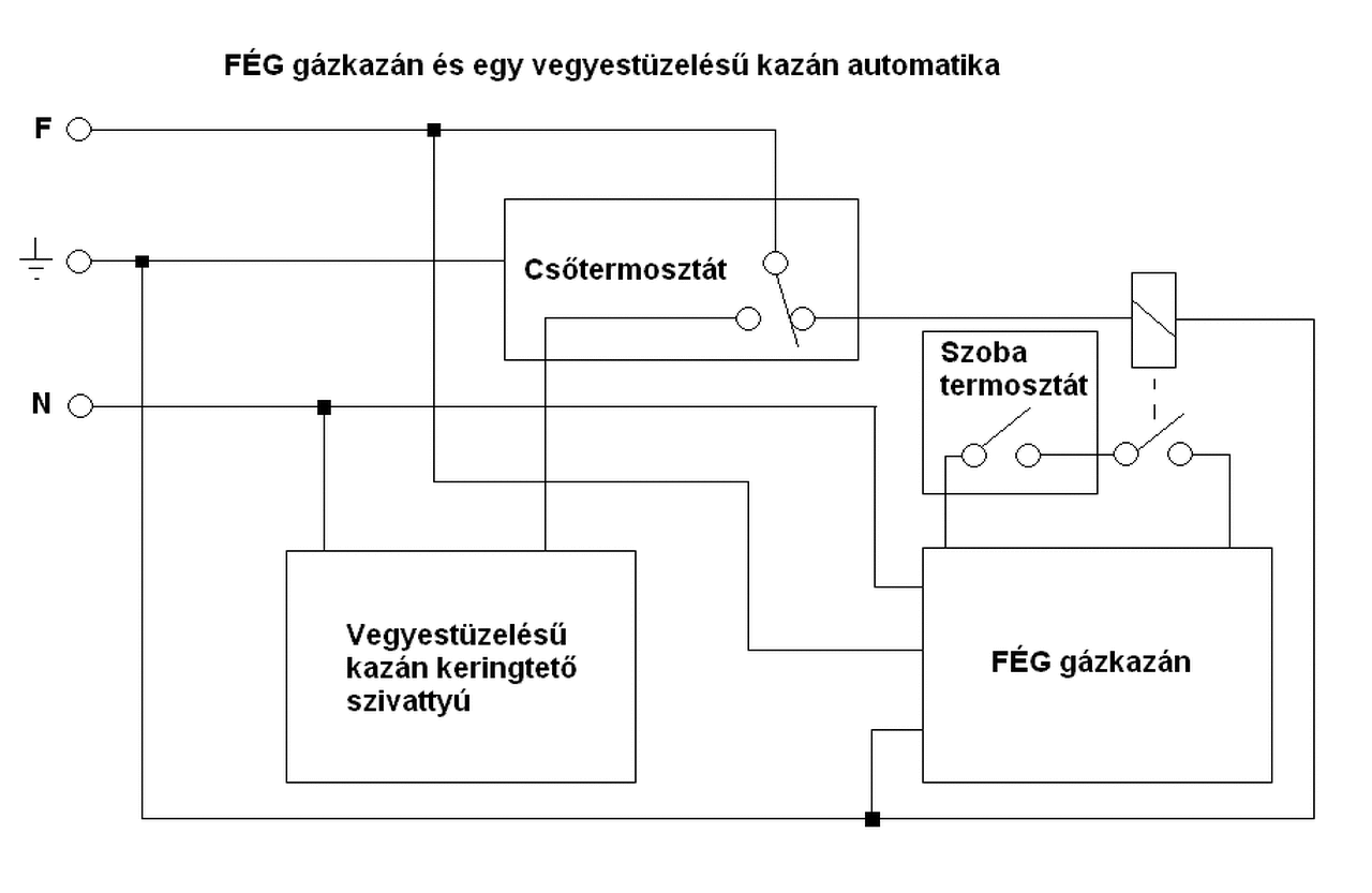 Anyósoméknál adott egy vegyestüzelésű kazán huzatszabályozóval és egy háromfokozatú Grundfos keringtetővel. Valamint egy FÉG gázkazán a hőskorból. Továbbá régi radiátorok. Fel lett régebben rakva egy csőtermosztát a vegyes csövére más által. Most lett hozzá csinálva egy kötésdoboz. Eddig alap funkcióval működött, ha a beállítottnál melegebb volt a víz, akkor ment a vegyes keringtetője, ha alacsonyabb, akkor nem. A cél az lenne, hogy amikor nem megy, akkor másik ág engedélyezze a gázkazánt, ha a szobatermosztát is úgy akarja. Az egyszerű FÉG utánkeringtető panel miatt gondolkodtam azon, hogy magát a csőtermosztát kapcsolt fázisát adom a termosztátra és nem amit a panelon belül kap. Így kimaradna a biztosíték és a tekercs. Persze a panel többi része fixen kapná a fázist is, hogy működhessen az utánkeringtetés. De legyen inkább biztonság, lesz benne egy relé és a termosztát kör lesz megszakítva vele. Láttam itt egy rajzot, ahol ugyanaz a panel van. A kazán termosztátján keresztül megy egyből a fázis, így jut el a szobaira. Tehát ehhez át kellett volna alakítani a panelt, inkább nem teszek ilyet. Igazából 99%-ban a vegyes fog menni, csak tartaléknak van a gáz és esetleg a komfort miatt, hogyha nagyon hideg van éjjel és teljesen leég a kazánban a tűz, lehűl a lakás, akkor ne kelljen felkelni. Ez most még korlátozottan fog működni, visszacsapószelep majd csak tavasszal lesz benne, így kézzel el kell zárniuk előtte a vegyes csapját. Bár lehet, hogy nem okozna túl nagy hibát, talán leállna a gázkazán némi időre, mivel átmelegíti a csőtermosztátnál a vizet, talán nem... A relé elvileg kis fogyasztású lesz, de csak motoszkál bennem, hogy ne menjen feleslegesen... lehet rakok sorba vele egy kapcsolót a dobozra, és amíg nincs nagy hideg, ki lesz kapcsolva. Rendben van ez így? A hozzászólás módosítva: Nov 18, 2014
