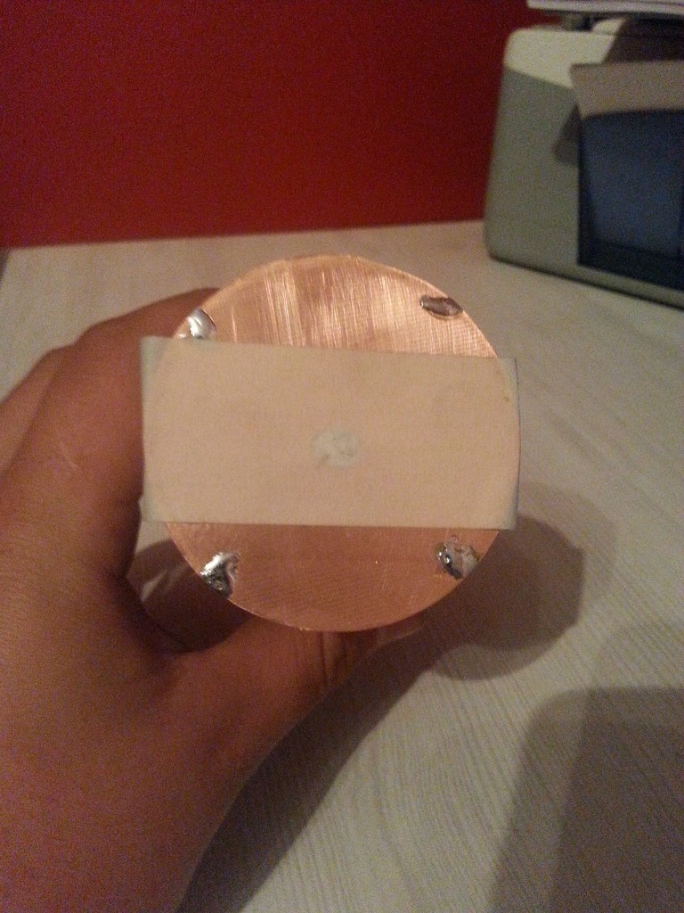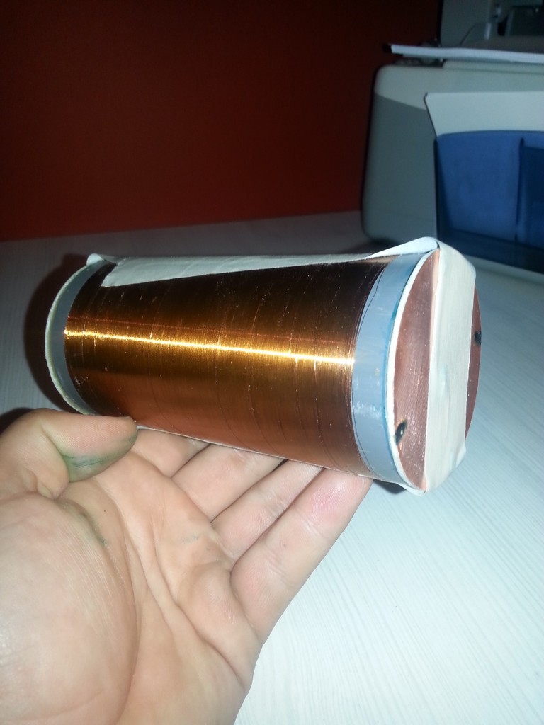 Csináltam ma egy szekunder a mini SSTC-hez.0,1es huzal 1100 menet.Kézzel vittem fel mert nem sikerült a fúrógépes megoldással.Mivel hordozhatóra szeretném csinálni ezért úgy akartam ,hogy semmit se kelljen csatlakoztatni csak "odatenni" a szekundert a helyére.Ezért a 2 végére kerek nyáklemezeket vágtam.A cstalakozás egy ugyan ilyen kerek nyák.Csak odateszem és meg is van.Illetve mindegy ,hogy merről teszem bele.?Még maszkolószallag tartja ,de odaragasztok a csévét a nyákhoz.