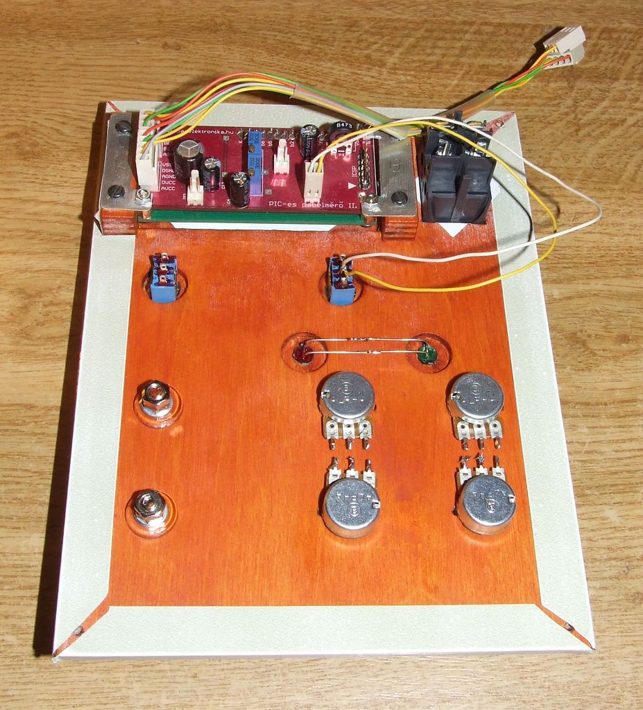 Azért van egy apróság, amire nem gondoltam (a képen nem látszik). A potmétereim forgási tartománya 300°, a nekem megszokott 270° helyett. Ezért a minimális és maximális állásban a jelzés "lelóg" a skáláról. Alig észrevehető az oldalankénti 15-15° túlfordulás, de azért ott van.