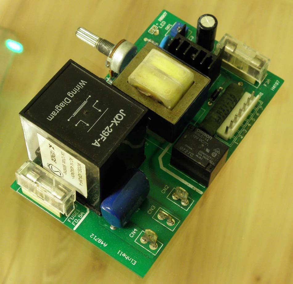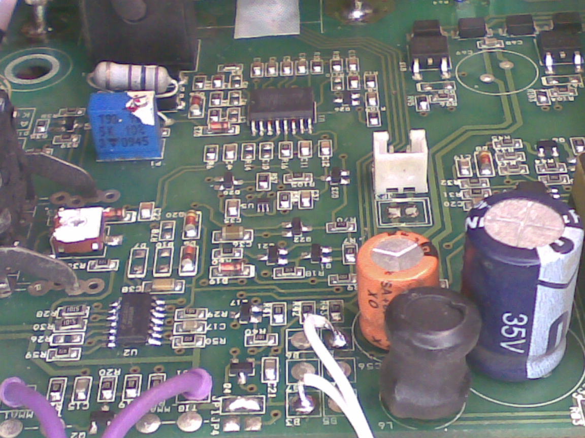 A fényképeket nézve tisztán látszik a tervezett elavulás nyoma. A trafót úgy tették rá a vezetősávokra,hogy nem tettek alá szigetelőlemezt. A trafó terhelésekor fellépő rezonancia pedig el erodálta a vezetősávokat, sőt a ferriten keresztül zárlatba került a szabályzóköri rész a főáramú résszel,mint ahogy látszik is a trafó alján. Jó néhány alkatrész elhalálozhatott emiatt.