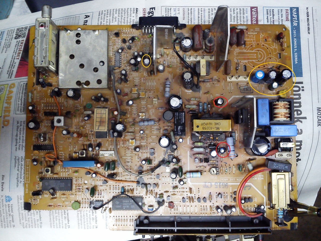 Van egy Schneider STV3680 névre hallgató tv. A gond az, hogy egy nap se kép se hang, csak halk búgás bentről. Bekapcsolásnál kattanás, kikapcsolásnál kattanás de semmi más reakció. Többszöri próbálkozás után pukkanás, füst 1 kondi. Kis idő múlva megint pukkanás, füst 2 kondi. Burkolat levétele után hibás kondikat cseréltem és még egy pár gyanúsat a sorkimenő mellett. A srovégtranyót is cseréltem mert zárlatos volt. Összeszerelés után szintén zenész megint csak ugyanaz a két kondi elpukkant. Szakik véleményét várom mi lehet a baj, merre induljak el a hiba keresésébe. Képet mellékelem pirossal karikázottak a (robbanós) kondik, sárgával jelöltek amiket cseréltem. Válaszokat előre is köszönöm.