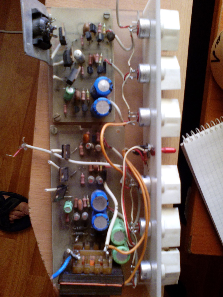 A LED-s panelt és a szűrős panelt összekötő vezetékeket lecseréltem rövidebbekre és vékonyabbakra (volt vagy 1-2m), illetve az egyik szűrű (nem, az amelyik átment oszcillátorba) kondijánál láttam volt egy nem kívánatos ón paca. Illetve 10k-s potikat bekötöttem.