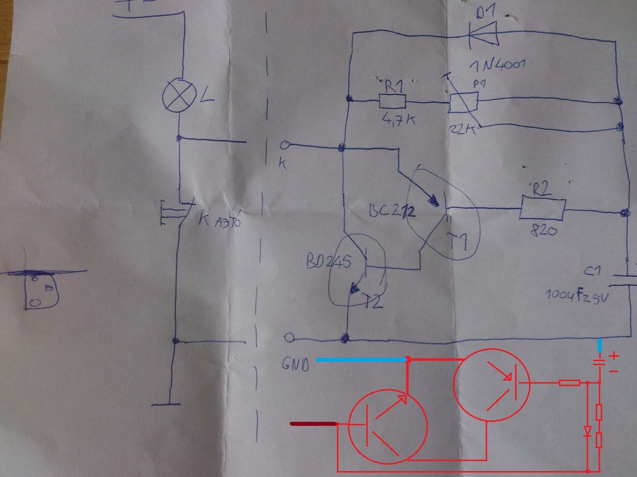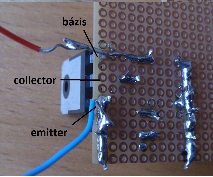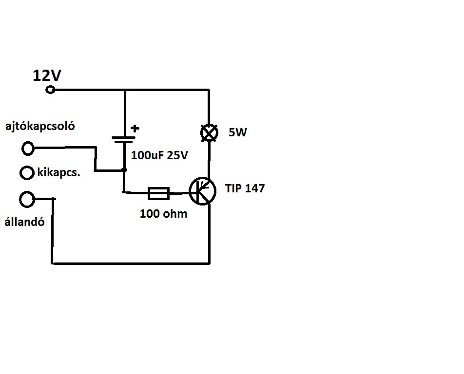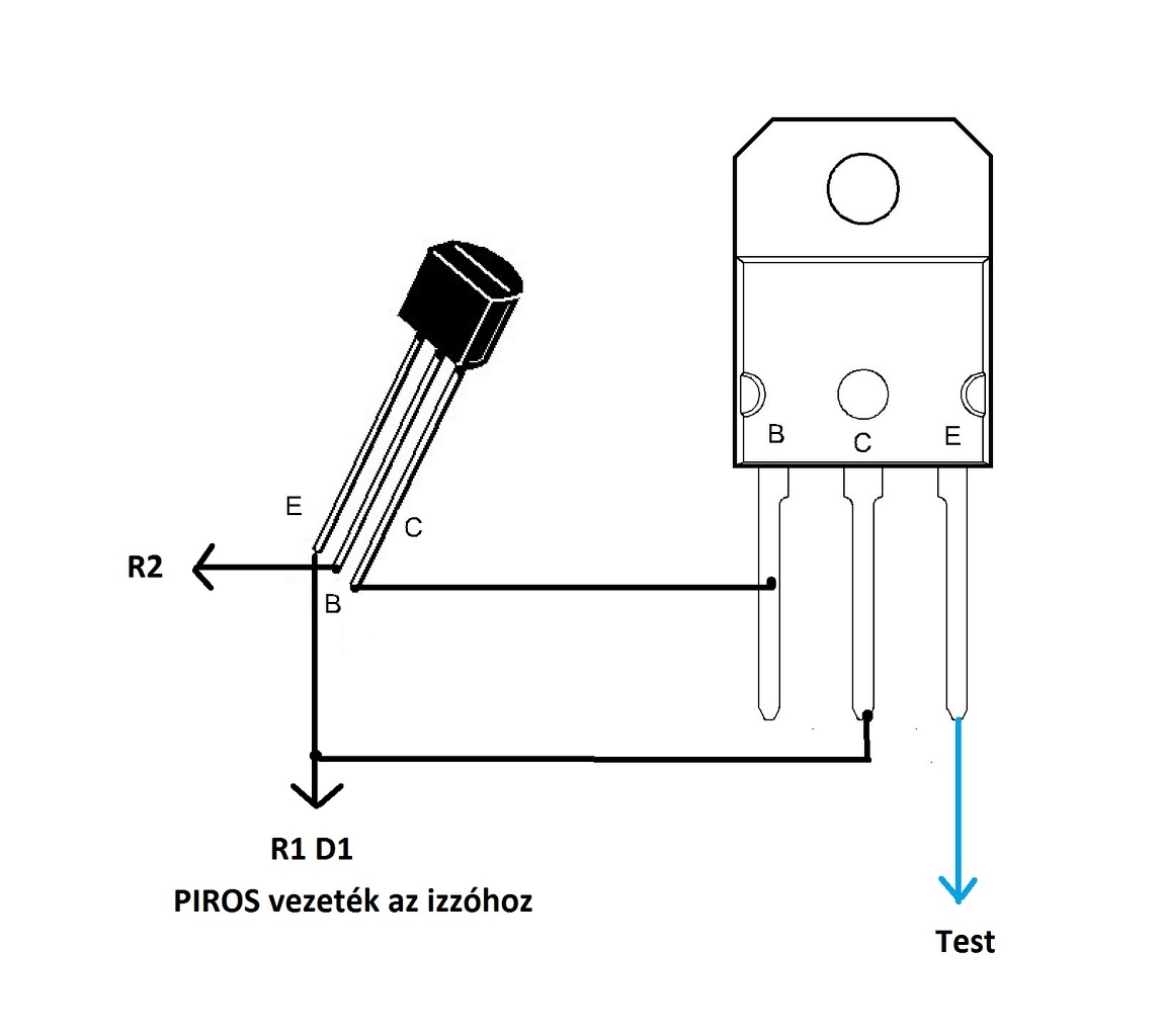 Akkor haladjunk sorjában. A vezeték színei szerint a piros az izzóhoz csatlakozik ami a tápforrás pozitív pólusára. A kék legyen test negatív. A BD245 tranzisztort a megfordított állapotában a D1 R1 a középső collector lábba a BC212 bal oldali emitter lába az izzóhoz kötendő piros színű vezetékkel legyen forrasztási kapcsolatban, mert most jelenleg D1 R1 a BD245 emitter lábbal és a kék negatív vezetékkel van forrasztva. A BC212 tranzisztor jobb szélső collector lába és a már megfordított BD245 bal szélső bázis lábával összeforrasztani. A tápforrást nem megszüntetni kell, hanem csak az ajtó kapcsolóval vesszük el a testet az izzótól, és ekkor lép működésbe az elektronikus kikapcsolás.