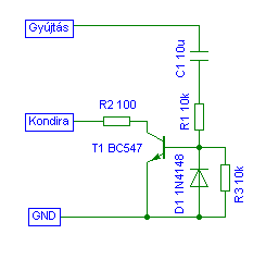 Első kapcsolásnál pld. megoldható, ha gyújtás ráadásakor egy tranyóval kisütöd a kondit, aminek bázisát, egy másik kondival egy pillanatra "bekapcsolod. Ekkor a bázisáram megszűnése után már hatástalan a kisütő.