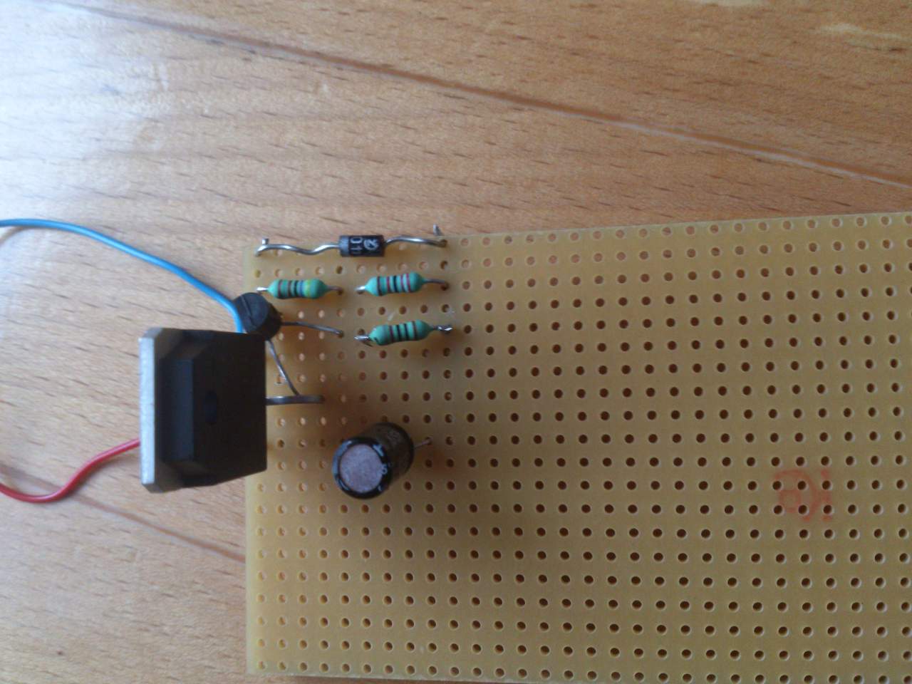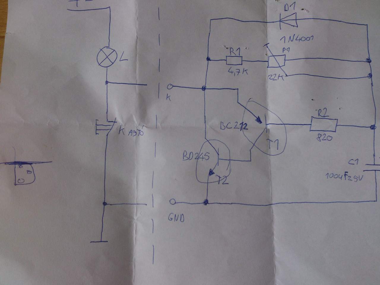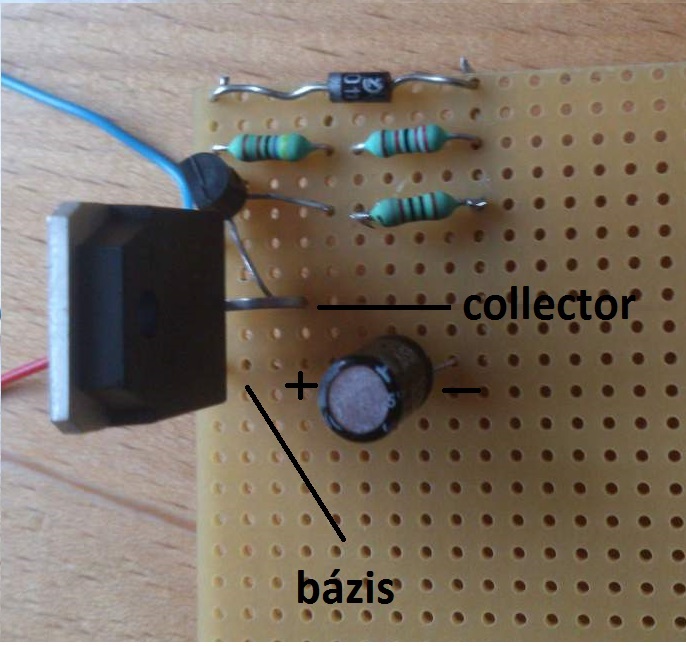 Közben összeraktam, és rájöttem, hogy rosszul írhattam, végül így raktam össze: A BD245 bázisa a BC212 collectorával van összekötva. A BC212 emitter lába a D1R1-hez, bázis lába az R2-höz megy. A BD245 emittere a piros vezeték-kondi, a collectora pedig a D1R1.