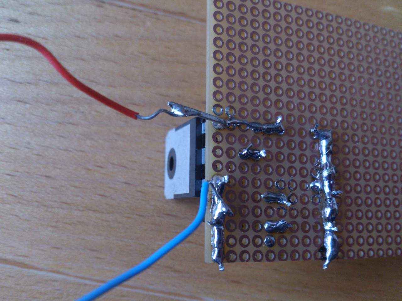 Akkor haladjunk sorjában. A vezeték színei szerint a piros az izzóhoz csatlakozik ami a tápforrás pozitív pólusára. A kék legyen test negatív. A BD245 tranzisztort a megfordított állapotában a D1 R1 a középső collector lábba a BC212 bal oldali emitter lába az izzóhoz kötendő piros színű vezetékkel legyen forrasztási kapcsolatban, mert most jelenleg D1 R1 a BD245 emitter lábbal és a kék negatív vezetékkel van forrasztva. A BC212 tranzisztor jobb szélső collector lába és a már megfordított BD245 bal szélső bázis lábával összeforrasztani. A tápforrást nem megszüntetni kell, hanem csak az ajtó kapcsolóval vesszük el a testet az izzótól, és ekkor lép működésbe az elektronikus kikapcsolás.