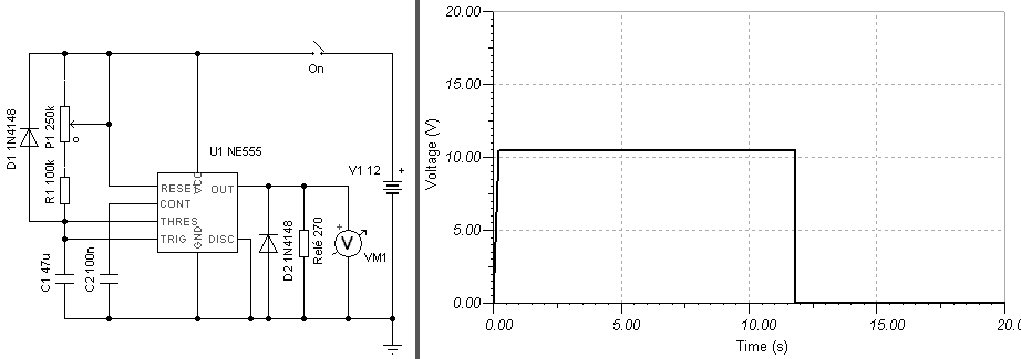 Olyan kapcsolásra lenne szükségem, amely feszültség alá helyezve rögtön meghúz egy relét, majd 5-15s múlva elejti. A tápfeszültség ezek után is rajta marad a kapcsoláson. Tápelvétel, majd ismételt ráadás után ismétlődjön meg a folyamat. Az áramkört 12v-ról szeretném működtetni.