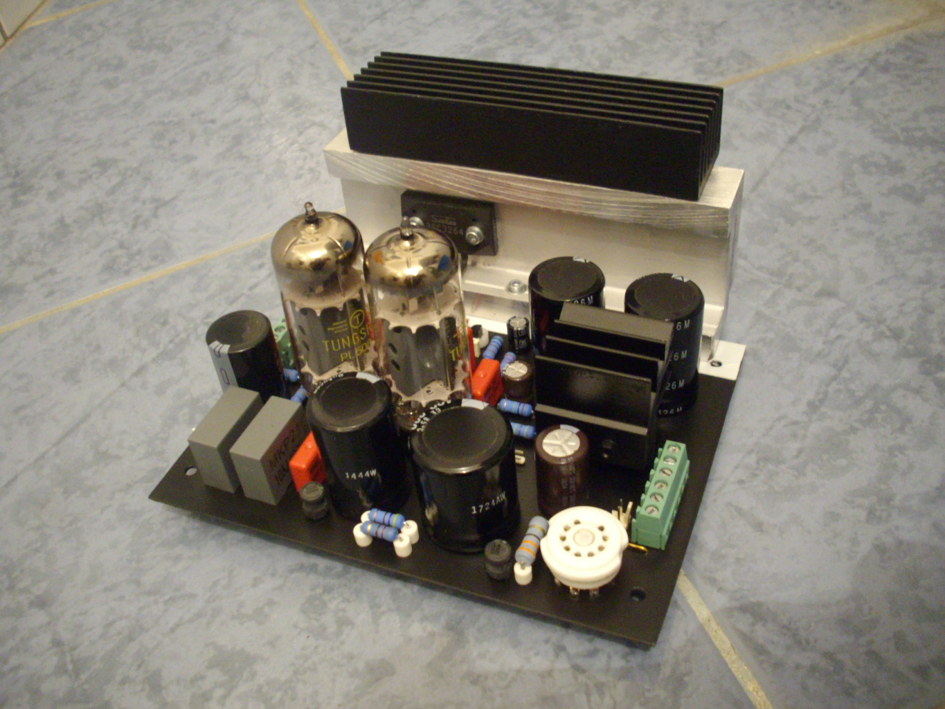 A héten én is készítettem egy kis tápegységet. Csöves hibrid erősítőmhöz terveztem. Dupla áteresztő csöves, egymástól függetlenített rendszer a jobb-bal oldali csöves meghajtásnak. (Az áthallás jelenségének csökkentése). A már hangilag kellően kikísérletezett és jól bevált egyutas csöves egyenirányítással az elején. A tápzaj elnyomásról a cr-crc szűrés, valamint az áteresztő csöveken ejtett jelentősebb feszültség gondoskodik. A fűtés rész lelhető fel még a nyákon, ami egy szimpla darlington hajtású szabályozhatő átereszős elv. (+ egy kis kiközepelés) Végezetül akkor pár kép: