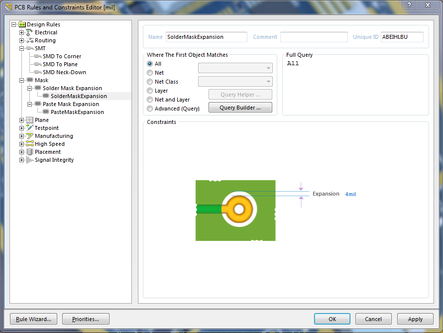 Kevésbé elegáns megoldás, ha Solder Mask Expansion értékét manuálisan adod meg, és az értéknek az egész forrszem sugarát adod meg mínuszban. Tehát egy 50 mil-es forrszem esetén -25 mil-t.