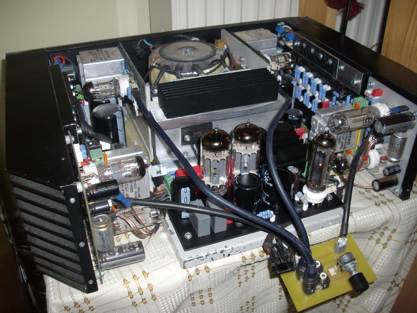 Kellett valami gyors zenehallgatáshoz és így készült ez a kis hibrid, a fiók anyagából. Egy KA2206-os integrált áramkör elé egy ECC85-ös került és egy EM80-as varázsszem mellé, a külcsíny kedvéért. A hifitől messze van, de kellemes a hangja és kb. kétszer másfél wattal szépen csicseregnek a 75 wattos Unitrák.