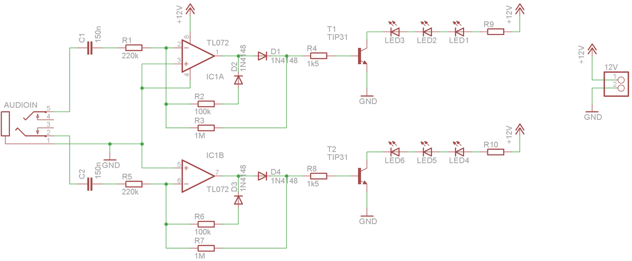 Hello! Ha ez számodra megfelel, működhet így. De a bementi 1,5kohm-ot cseréld 33kohm-ra, az 1µF-os kondit egy 47nF-ra. Mert különben nagyon terhelni fogja azt, ami az erősítőt meghajtja. A tranyó bázisa és a műveleti erősítő kimenete közé tegyél egy 1kohm-ot. Mert nem illik a tranyót közvetlen a kimenetre kötni. Ha 3 Led-hez 12V mellett 43ohm-ot használsz, akkor 56mA lesz a Led-ek árama. Nem sok ez a Led-nek? Annak nézz utána. üdv!
