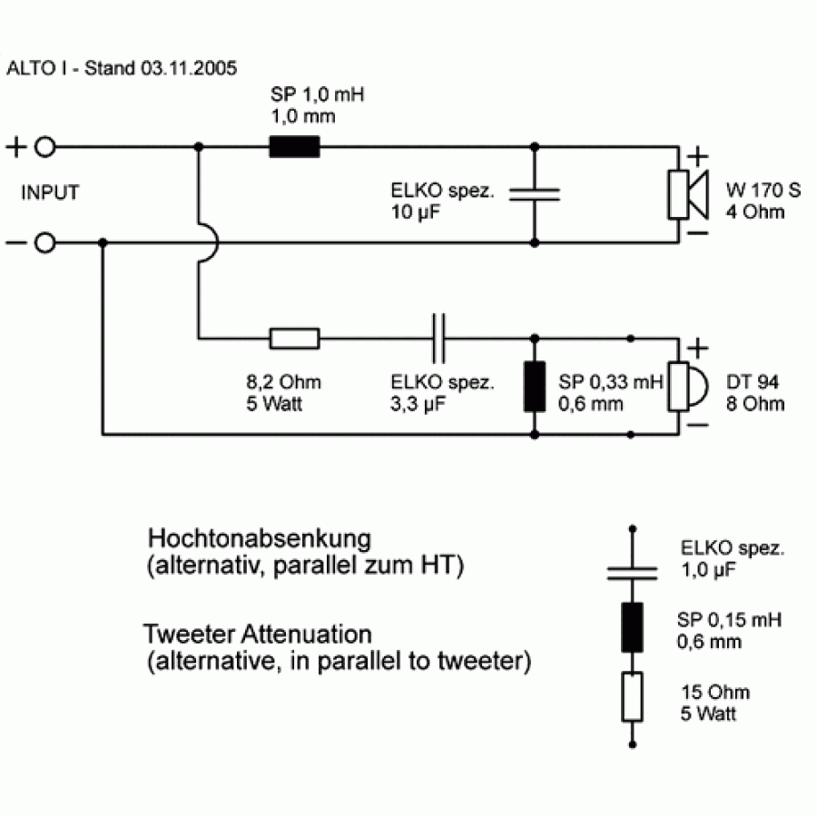 A soros 12 ohm ellenállás kb 8 dB csillapít , utána egy 2000 Hz-re méretezett másodrendű váltó van. Ha magas még így is túl harsogja akkor az ellenállás értékét lehet növelni. Ha középen emel ki túlzottan akkor a magason polaritást kell fordítani.
