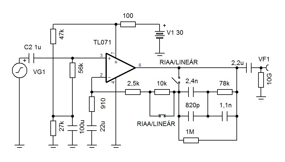 Jónak tűnt a szimuláció alatt, ámbár ha Én ezt megépítem, akkor modul felépítésű RIAA lesz belőle egy Videoton rádió-erősítőben, ahol ennek az IC-nek egy lineáris (nem RIAA karakterisztikájú) szintemelő / illesztő erősítő szerepét is el kell majd látnia az FM és az AM modulok erősítésére /sajnos!/ az Én rajzom alatt a nem invertáló láb "féltápfeszültségre" emelése a Videoton korrektorban megvalósítottak alapján történik, továbbá a tápellátás is!
