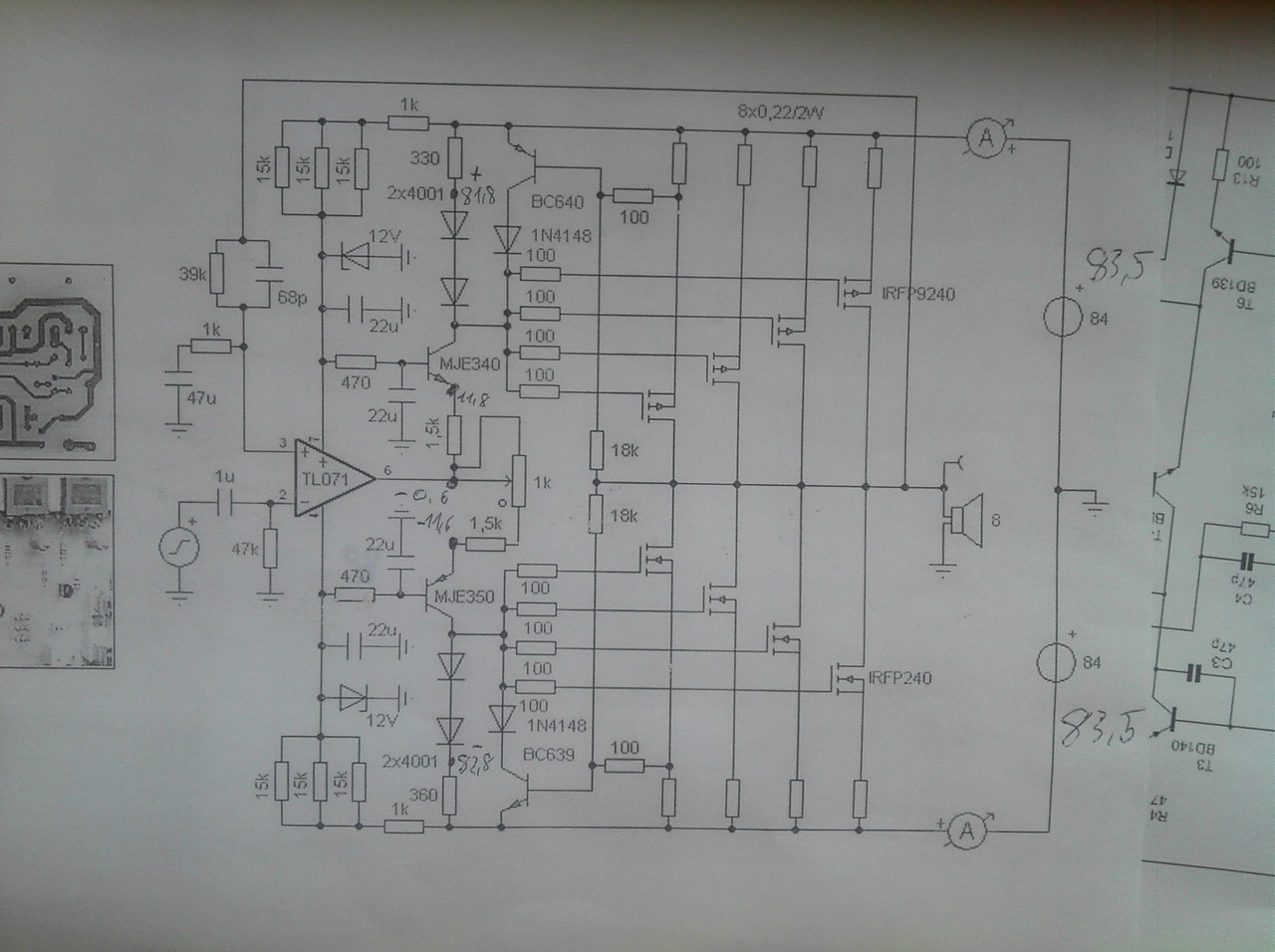 Szia! Hát nem túl informatívak a fotóid. Nézd meg az MJE340/350 tranzisztorokat, az ECB lábkiosztásuknak megfelelően ültetted be?
