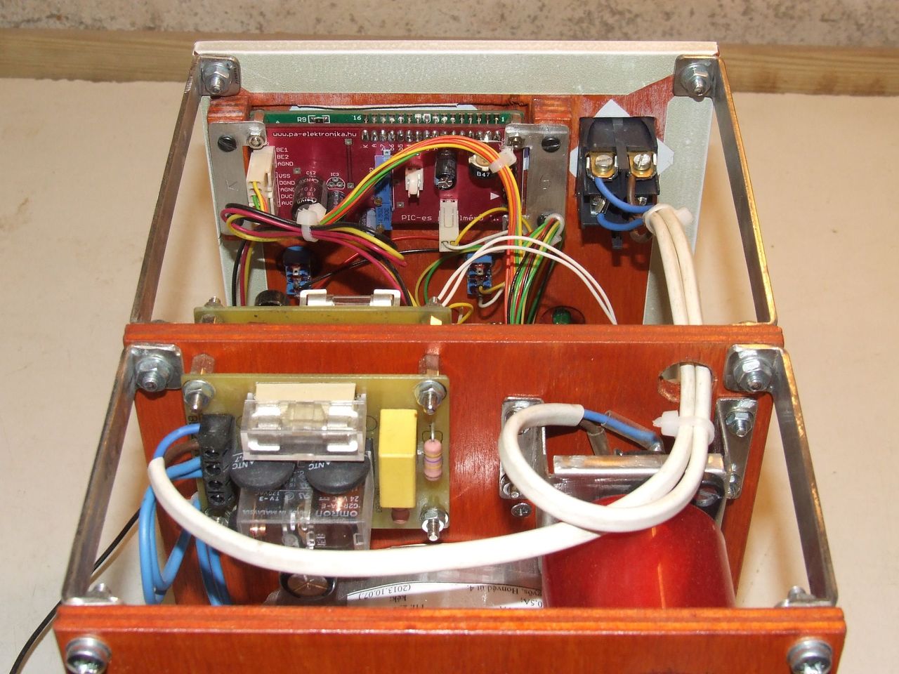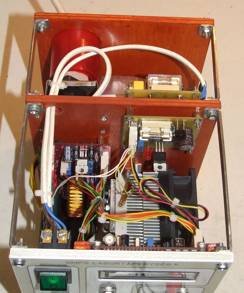 1.- "Szerkezetkész" az SMPS-II. utánépítésem. Alapvetően eltérő a dobozolás mint az eredetié, de azt hiszem remek alternatíva lehet ez is. Elsősorban az előlap méretét akartam megnövelni, de az így adódó magasságtöbbletet is kihasználtam. Minden rész egyetlen lap két oldalára van szerelve (belső lap), így jól kézben tartható egységet képez a teljes konstrukció. Persze a minden alól kivétel a kezelőszervek és a kijelző, mert ezek az előlapon kaptak helyet. Úgy igyekeztem elhelyezni az egységeket, hogy azok éppen ott legyenek, ahol szükség van rájuk, beleértve ebbe a belső huzalozást, és az előlapi elrendezést is. Ha esetleg szervizelni kell, akkor az előlap kifordításával mindent jól meg lehet közelíteni.