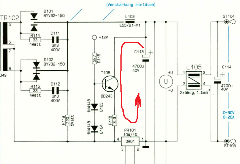 Nos ahogy nézem ez a tranyó egy áramgenerátor, a két nyitó irányba előfeszített diófa nyitja a T105-öt, amitől azon áram kezd folyni, üríti ki a C113-at de ez az áram feszültséget ejt R118-on ami megemeli az emitterét, így csökken a B-E fesz azaz beáll egy szép stabil áramgenerátornak. A kérdés az hogy erre miért van szükség. PR101-en ráadásul ezt az áramot figyeli is. És ahogy nézem ezen kívül nincs is más soros ellenállás az áramkörben, azaz a táp áramgenerátoros üzeméért is ez a sönt felel. Viszont a T105 miatt nulla terhelés esetén is folyik rajta áram. Mondanám hogy azért van a T105 mert a kimeneti elkó (ami most nézem nem is 4700µF mert kettő is van, azaz összesen majdnem 10000uF!) nagyon nagy és a feszpoti letekerésére emiatt nagyon lassan reagálna a táp terheletlen kimenet esetén. De nem mondom, mert van egy olyan gyanúm más ok is áll a dolog mögött. De megjegyzem hogy ha az áramot ezen a söntön méri, márpedig máshol nem tudja, akkor a T105 és a két diófa hőfüggése miatt az áramszabályozás és mérés nagyon nem lesz stabil.