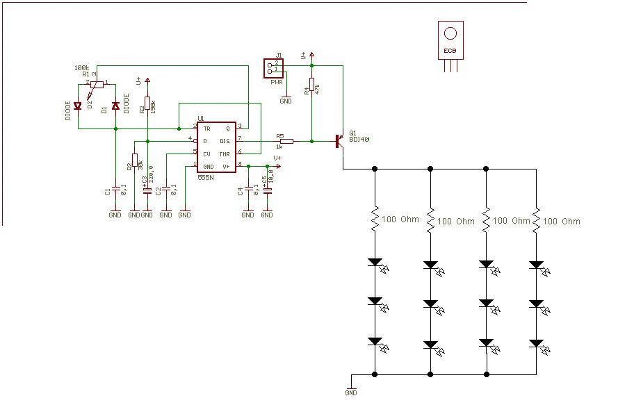 Csatoltam egy képet, amire rárajzoltam a LED-eket. Így jó lesz. A 100 Ohmos ellenállások körülbelül jók. A tápod stabil 12V? (az lenne jó, mert a 100 Ohmok kb azzal jók, az 555 IC max 18V-ot bír, de ezt nem illik megközelíteni, 10V alatt meg már nem világít 3 db soros fehér LED) Igen, a J1 a táp csatija. Ha a C1 100nF-os kondi-val párhuzamosan teszel ideiglenesen egy 10-47µF-ot, akkor láthatod a működését lassítva. Ja és most nézem a rajzot, az IC 4-es lábát kötheted direktben a +12V-ra( mint a 8-as láb). A most rajta lévő alkatrészek nem kellenek(C3, R2,R3) A hozzászólás módosítva: Jan 2, 2014