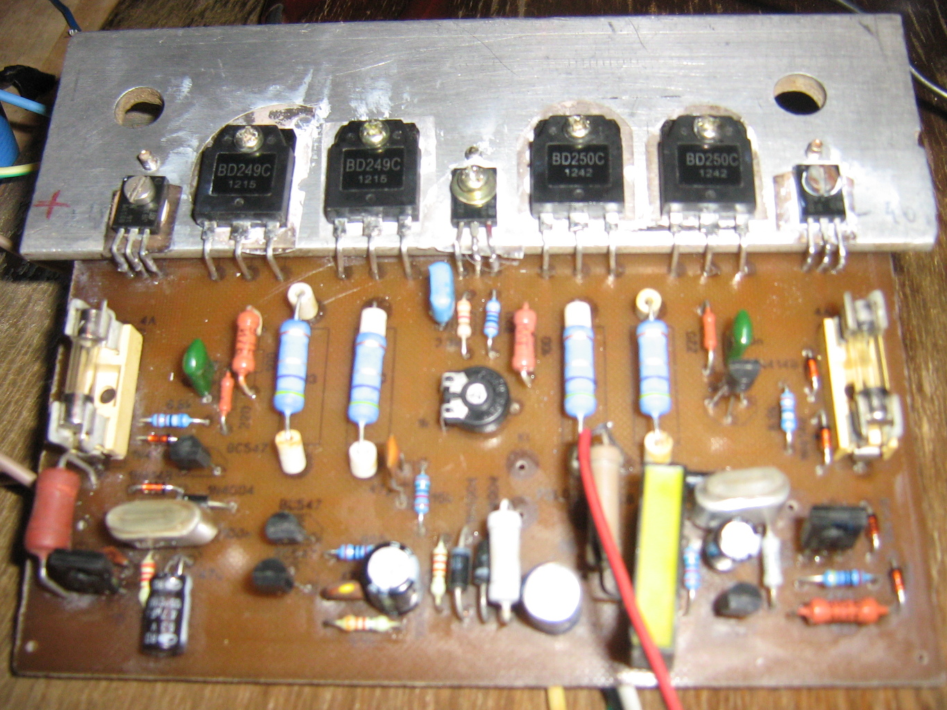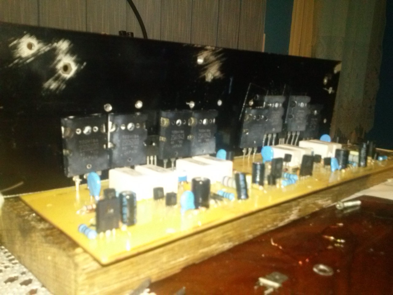 A 820 R es ellenállásra ráforrasztottam egy 750 R ellenállást így az eredő ellenállás kb 390 R lett. Sokkal jobban szól, így már nem kell a 470 pF kondenzátor értékét se megváltoztatni. Ja és tápágankénti 10000mF-os kondenzátorokat, még kísérletként megspékeltem 270000mF-al, amint a képen is látszik. Annyira jól szól így hogy megépítem a párját is. Ami a melegedést illeti, az L idomra rátettem még egy komolyabb alubordát szinte nem is melegszik. Kísérletként a 0,47 R emiter ellenálláson 10 mV –ot az 1K potival feltekertem 40 mV-ra de ugy se melegedett . Aztán visszavettem a 10 mV-ra.