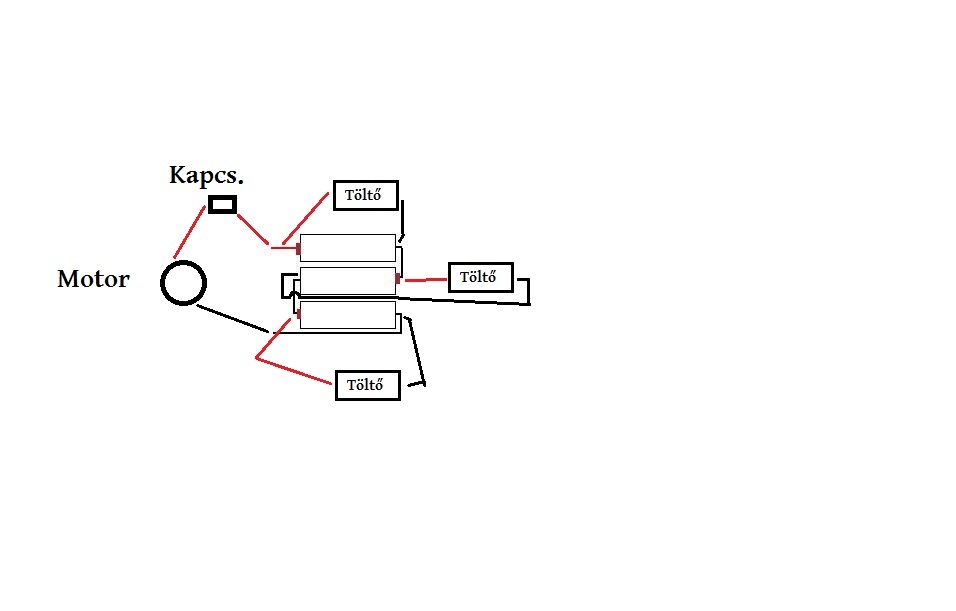 Na jó,de még mindég nem értem. Ahhoz hogy működjön a porszívó sorba kell legyen kötve a három db akku,hogy legyen meg a 3,6V. Ha tölteni szeretném külön külön akkor meg el kéne legyenek választva egymástól nem? Gondolom nem lehet sorba kötve is?meg úgy tölteni ahogy berajzoltam. Vagy nem jól értelmezem?