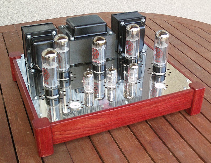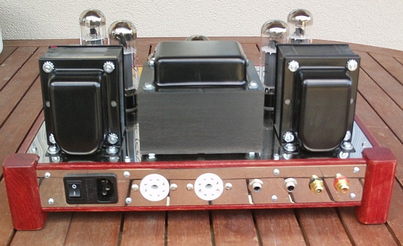 Csöves erősítő építésben teljesen kezdő vagyok. Két éve böngészem az internetet. Rengeteg verzió közt bolyongtam. Míg végül úgy döntöttem, hogy megépítem a legendás Dynaco ST70 erősítőt. Nos, ez sikerült is. A trafókat a Triode Electronics-tól szereztem be. A meghajtó fokozat a Shannon Parks féle megoldás. A csövek jj-electronic gyártmányúak. A panelen helyet kapott két varázsszem cső is, amelyeket később giccsesnek találtam, emiatt nem is használom.