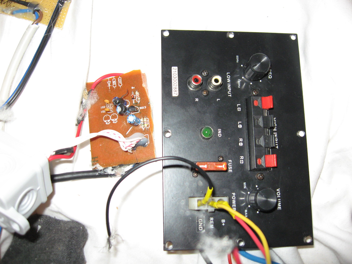 De jó lett volna pedig! Akkor írom lépésenként: a szűrő panelre menő +12V-ot szakítsd meg és tegyél be egy 100 ohm körüli ellenállást, hogy ezen menjen keresztül a tápfeszültség. Az ellenállás szűrő panel felőli végére és a szűrőpanel testre köss egy 470µF körüli kondenzátort. A kondi polaritásjelölésére ügyelj! Ez lenne hivatott arra, hogy mikor a végfok beterhel az akkumulátornak és esik egy keveset a feszültség, akkor a szűrő tápfeszültségében ez ne jelenjen meg közvetlenül.