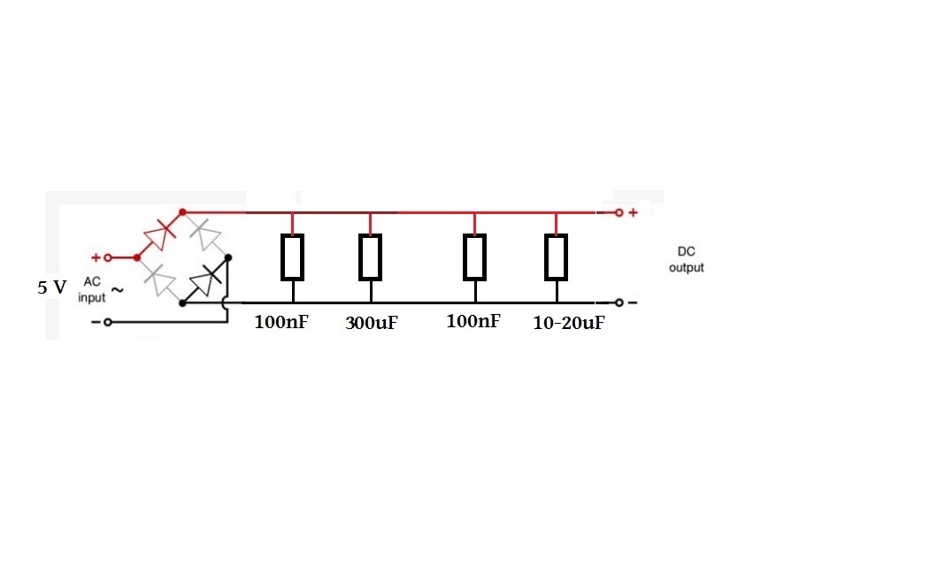 Sziasztok!Van egy 5V AC adapter. Az 5V AC-ból szeretnék 5V DC-t csinálni.Milyen alkatrészek kellenek és mit hova kötni? Köszönöm a válaszokat.
