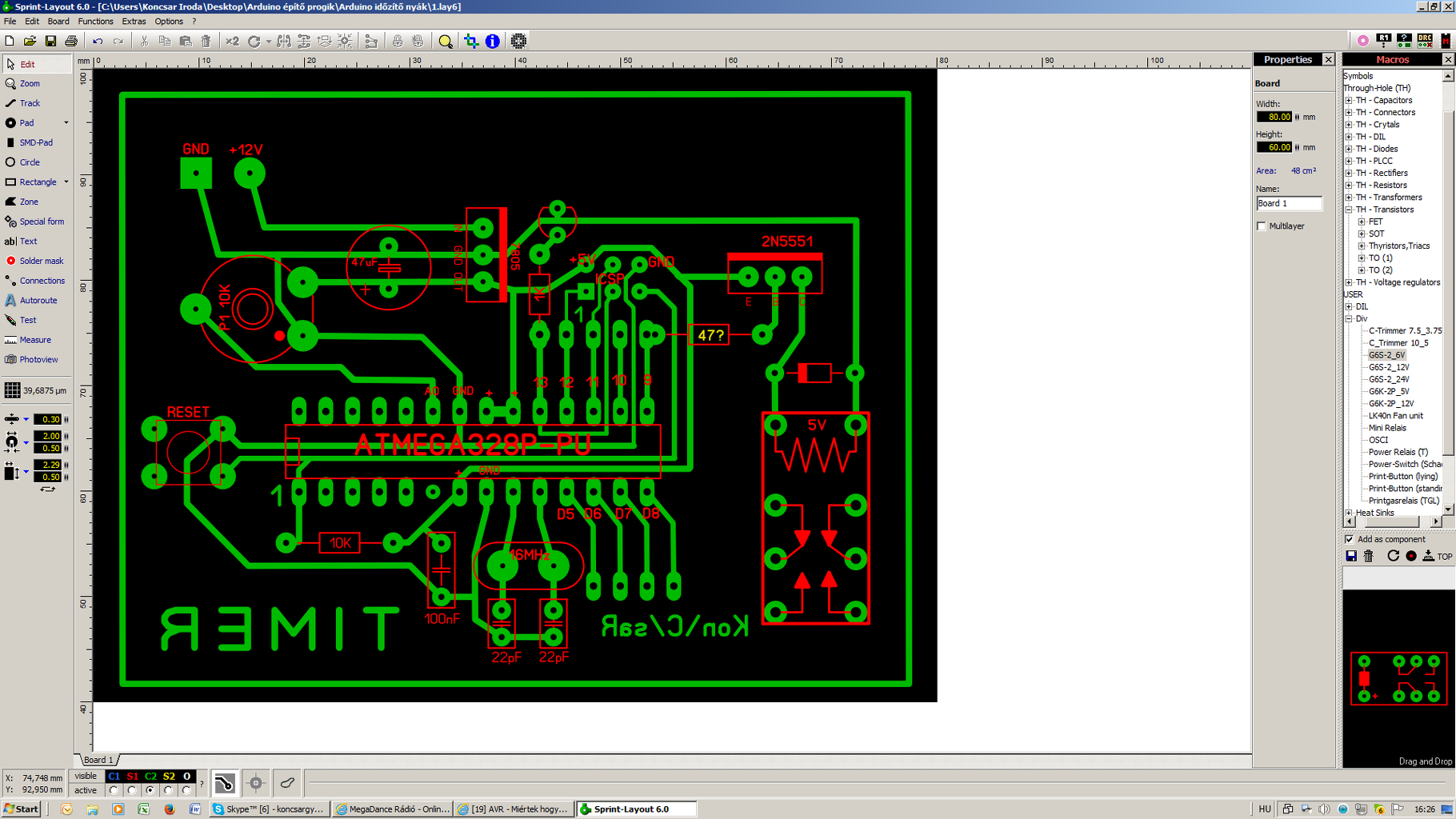 Szia Robi! Tudsz segíteni egy olyanban, hogy célszerű ezt a kis időzítőmet összeállítani? Felteszem amit elkezdtem, de egy ilyen egyszerű kis körben nem szeretnék áthidalásokat csinálni. De Másoktól is szivesen veszem a segítséget. SMD alkatrészeket nem szeretnék használni. Az Atmega328P-PU hoz az ICSP csatlakozót, hogy célszerű elhelyezni? Köszönöm.