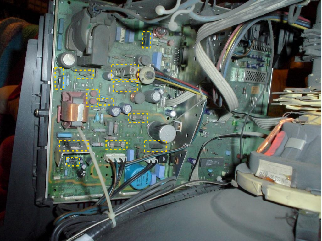 Mert ha nincs , akkor nehéz lesz. Mindenek előtt pormentessé kell tenni a készülék belsejét .Alaplaptól kezdve mindent porszívózz ki egy ecset segítségével.Azután kell egy műszer , és a sárga szaggatott vonallal bejelölt dolgokat ki kell mérni.Egy biztosítékot látok , hogy az több mint valószínű , hogy elszált. De akkor annak már oka lesz.Szóval ??? Lesz hozzá némi tudás ?