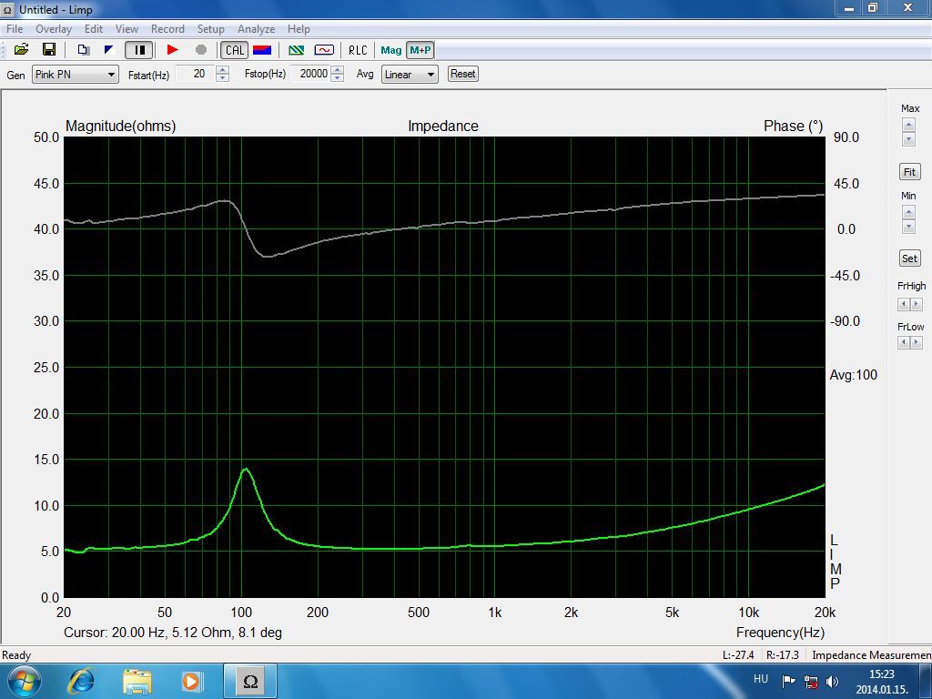Igazán nem akarom teleoffolni a témát, de a hangkártya volt a ludas. Itt látható egy H2000 HC17-580-as szélessávú impedanciamenete. (100 átlagolással, bár át fogom állítani 10-re, ahogy Ptesza is javasolta) Az impedanciaérték még nincs rendesen beállítva, egyenlőre örültem hogy működik. (Egyébként a műszerem zsinórjának tényleg annyi az ellenállása! Valami vékony *** amit gyárilag adtak hozzá... )