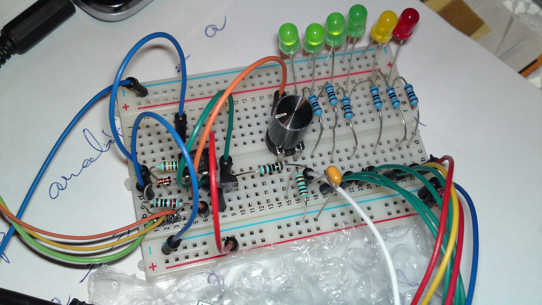 Most működik rendesen csak mégsem jól közepes hangerőnél már világit mind az 5 led. Így van megcsinálva ahogy a képen van. R1 és C1 nek mi a szerepe?