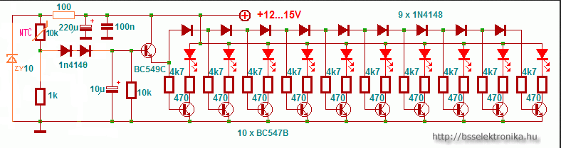 Nem igazán erre való ez az egyszerű áramkör. De í mellékelt rajz szerint talán megoldható. Ugyan is a skála végét és elejét illeszteni kellene a kijelzőhöz. De az NTC sem lineáris eszköz, beállításra meg nem sok lehetőség van. Hiszen itt a tranyók és a diódák határozzák meg a szükséges bemenő jelet. Megpróbálni legfeljebb akkor érdemes, ha van ilyen kivezérlésjelző áramköröd. Egy LM3914-el azért értelmesebb eredményre lehet jutni.