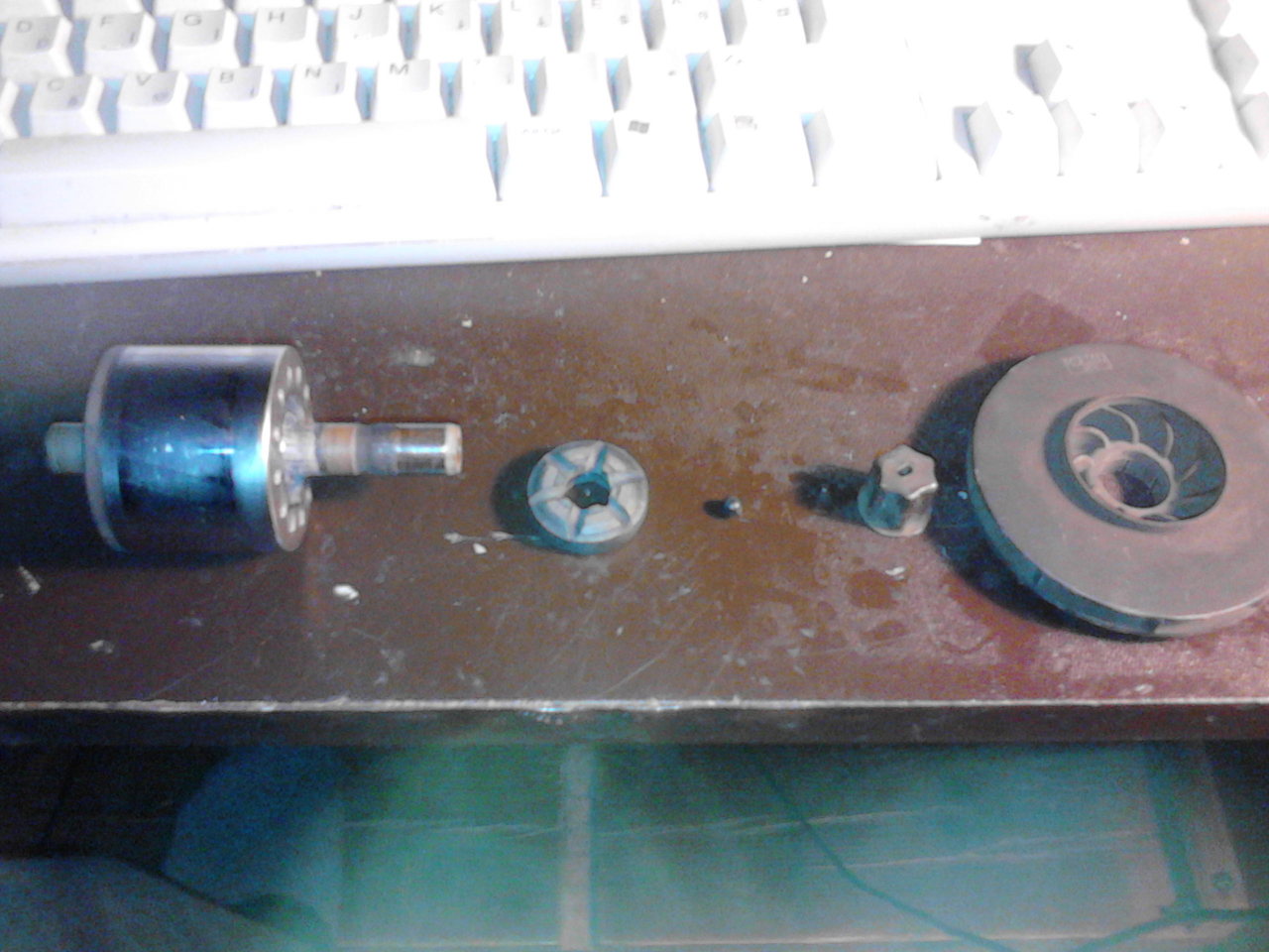 Idézet: „... a forgórészét szedte már szét valaki ...” Nem hiszem. De azt nem is lehet. A forgórészben egy öntött alumínium kalicka (rövidrezárt forgórész) van örökre egy egységben. A turbina lapát meg a tengelyre van sajtolva. Ezt soha nem kell (és lehet) javítani. Az állórészben van a valódi tekercs, elválasztva a vízrésztől. Tulajdonképpen evvel az ötlettel meg lehet úszni a tengely szimmeringeket, amikkel csak baj van hosszú távon. A baja ennek a megoldásnak, hogy a tengelyen nem lehet csapágy, csak vízkenés van. A másik baj az álló és a forgórész közötti műanyag köpeny miatt a megnövekedett légrés, ami a hatásfokot (teljesítményt) rontja. De ez ilyen értékeknél nem sokat számít. Visszatérve: a motor nem javítható gyakorlatilag sehogy. Ha egy másikból át van rakva a forgórész, korántsem biztos hogy a tengelyátmérő, stb. stimmelni fog. Itt pedig nagyon szigorú tűrések vannak. Csiszolni, esztergálni nem lehet, mert kerámiából van. Legfeljebb köszörülni lehetne, de az meg többe kerül, mint egy új motor.