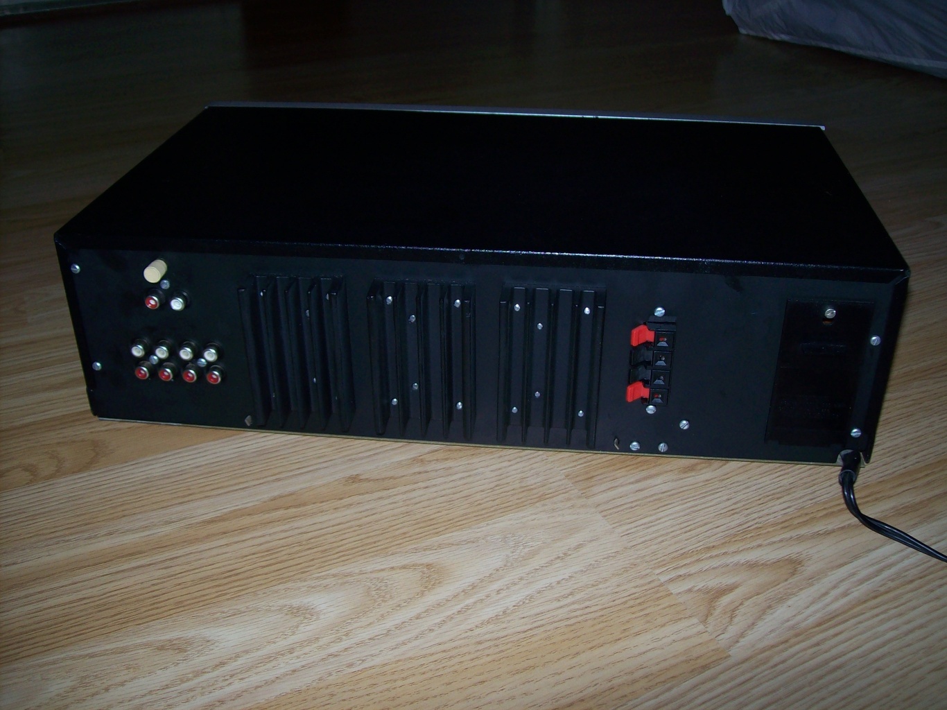 Sziasztok! Videoton EA6383S erősítő dobozába építettem egy integrált sztereó erősítőt. Az eredeti erősítőnek valaki jól szétgányolta a hátlapját a belseje meg kellett egy ismerősnek ezért döntöttem a szétbontása mellett. A doboz, a trafó, és a kivezérlésjelző maradt csak. Kapott új hátlapot immár 3db bordával, RCA aljzatokkal, csíptetős hangfalcsatival. Quad 405 a végfok RCA végtanyókkal. A jelútban nincsen elektrolit csatolókondenzátor csak fólia. Van benne hangszóróvédelem, a végfoknak biztosítékok, nyomógombos-relés bemenetválasztó közvetlenül a bemeneti aljzatokra szerelt nyákkal Matsushita relékkel.. 4db bemenet van: 1db Phono és 3db Vonal. A kiválasztott bemenetről van REC OUT magnó számára. Az aktív bemenetet egy LED jelzi vissza a nyomógomb felett. Műveleti erősítős hangszín van benne korai szériájú full fémházas, szén leszedő pogácsás vidi potikkal. 6,3-as jack fejhallgatókimenet. A mute gomb is működik, csökkenti a hangerőt. Azért lett szögletes mert az hiányzott és csak ilyet tudtam szerezni. Még hátra van az előlapon a bemenetek és a hátlap teljes feliratozása. A hangja sokkal jobb lett mint a széria erősítőé.