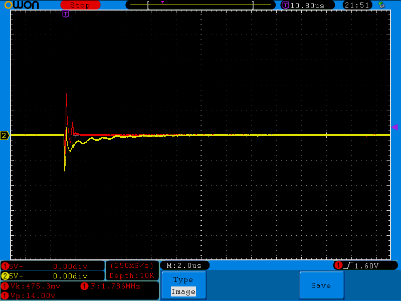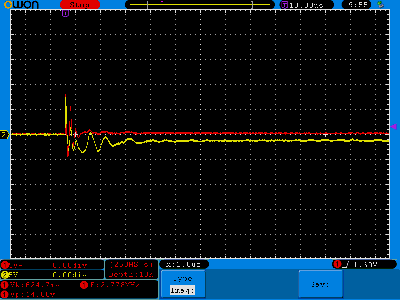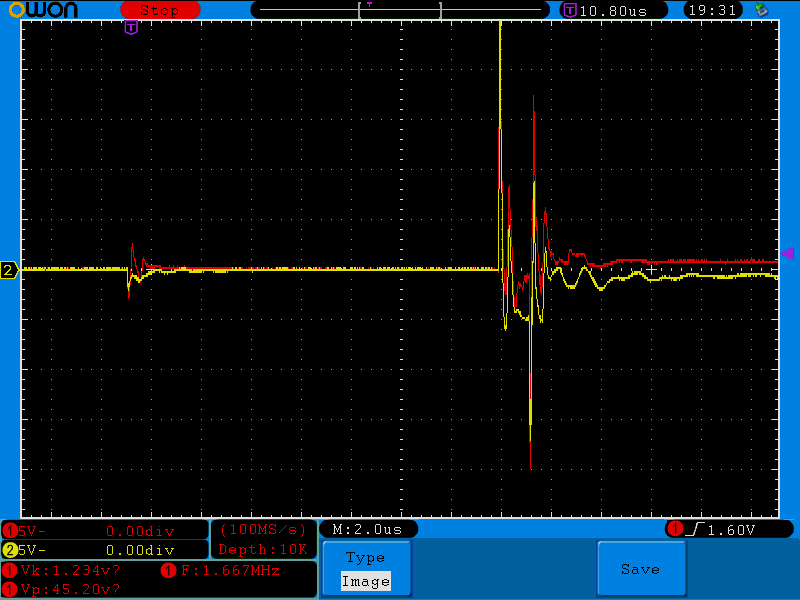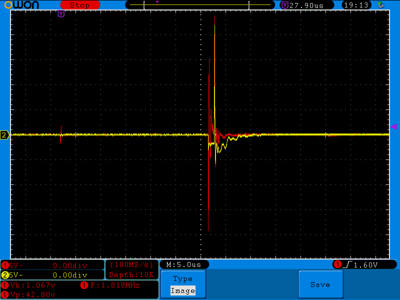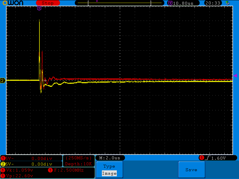 Na ránéztem szkóppal. Ki-be kapcsolgattam vagy ötvenszer, kisebb-nagyobb szünetekkel de most egyetlen egyszer sem indult nulla Volttal. Az első alkalommal sem, pedig akkor a legutolsó bekapcsolás óta legalább két nap telt el. No nem baj, azért megnéztem mi van az áram-szabályozó OPA-n. A piros jelalakok a 2-es lábon (invertáló láb), a sárgák pedig a 3-as lábon (nem invertáló láb) lévő eseményeket mutatják. Kisebb amplitúdójúakat is elkaptam, ezek a nagyobbak közül valóak. Valószínűleg ilyesmik reteszelhetik a tápot, mert azért a kb 15-25V-os tüskék egy 5V-os tápfeszű OPA bemenetén nem túl egészségesek.