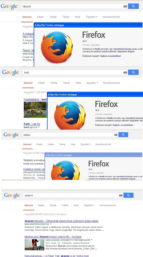 ![]() Most már mindenhol elől van a "képek" ahogy szeretnéd és csak a "videók"-at meg a "térkép"-et merte cserélgetni. Biztos, hogy lefigyelte a cég, amikor itt panaszkodtál. Viszont nem próbáltad ki az "index"-et mert akkor kaptál volna egy képek-hírek-térkép-videókat. ![]() Lányoknál logikus, hogy a képek után inkább videókat nézegetnél és nem a térképen keresgéled őket, az "akármi" meg helyre utal, szóval megint előre rakta a térképet. Tütütrü-nél nem tudta eldönteni, hogy ez egy török falu vagy egy különös állat, szóval megkockáztatta, hogy inkább videóznál. De legtöbben a képekre kattintanak a legtöbbször, szóval úgy érezte, az a leghelyesebb ha elől van. Lehet, hogy írok ebből egy 100 oldalas elemzést, aláírom mint brit tudós, aztán jelentkezek a Guglihoz, hátha felvesznek elemzőmenedzsernek... A hozzászólás módosítva: Jan 29, 2014