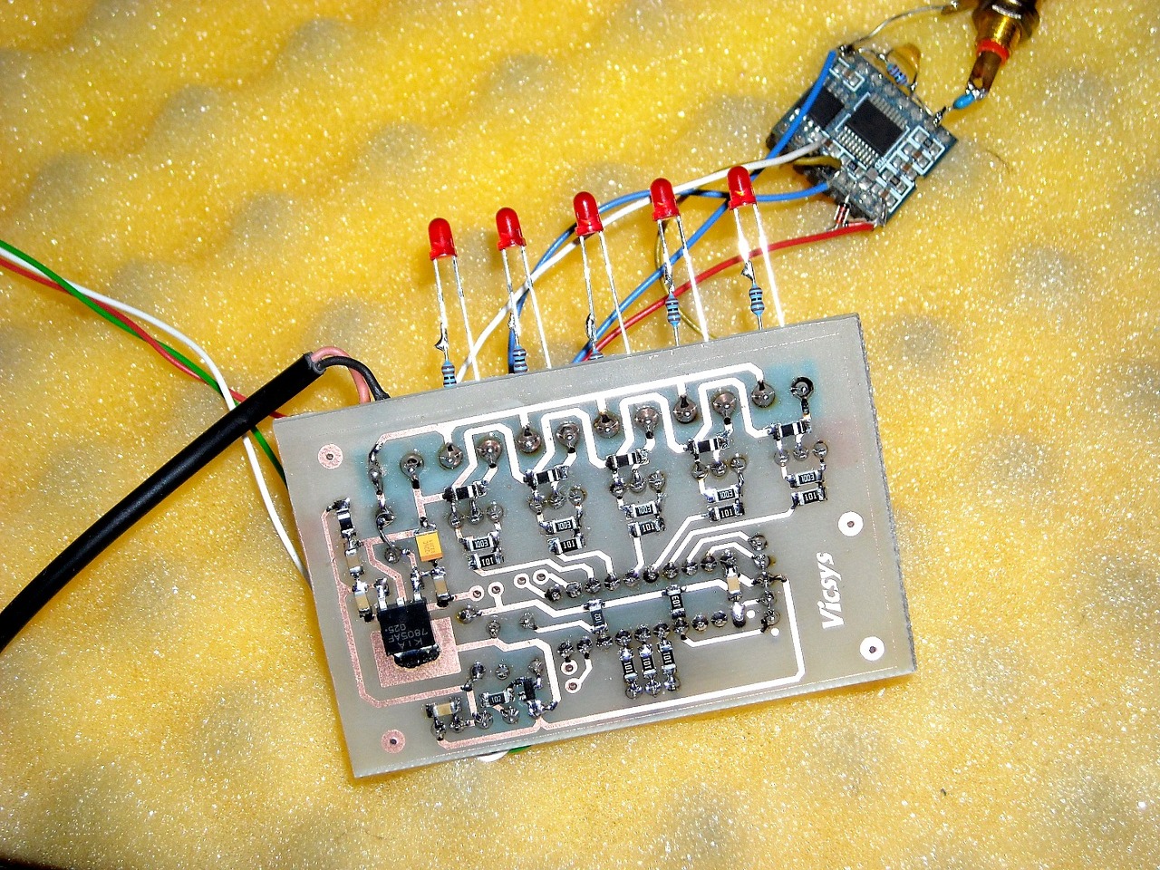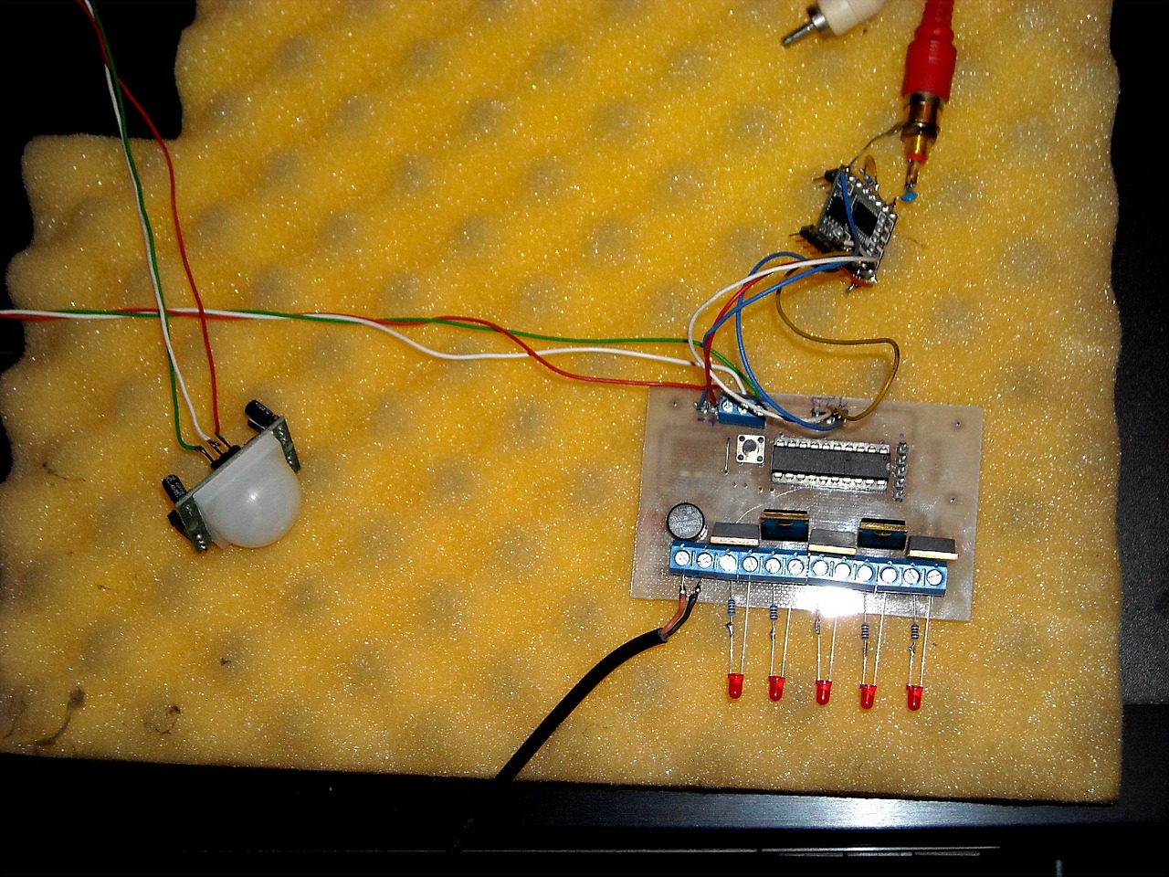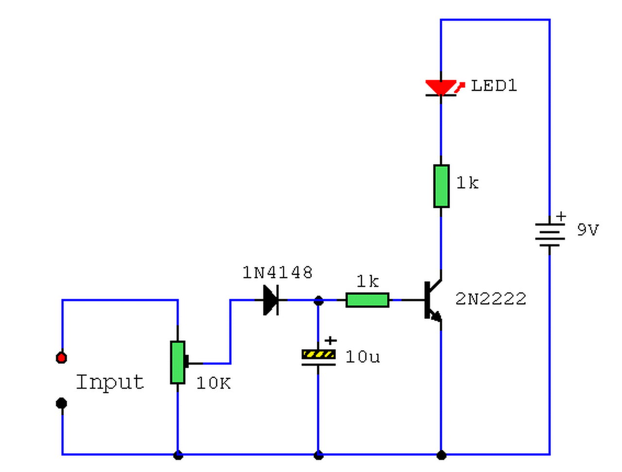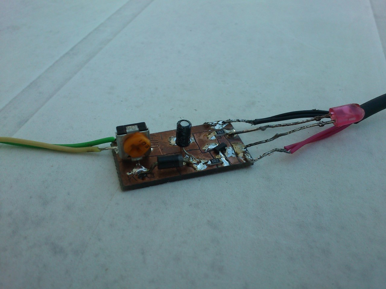 A kapcsolás egy weboldalról származik, apró módosításként a 10 mikrós kondenzátort 0,22-esre cseréltem, mert az eredeti verzióban a LED szinte folyamatosan világított. A tranyó, és a dióda olyan, amit a fiókban találtam, így nem pontosan olyanok, mint a rajzon, de a ketyere prímán működik!