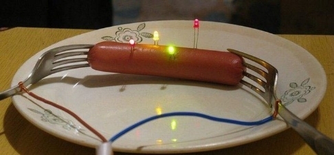 Nem lehet hogy a nagyobb felületen - ami a beleszúrt villából adódik - jobb a kontaktus és ezért kisebb ellenállást lehet mérni? Mérd csak meg úgy is azt a virslit! Vagy már megetted?